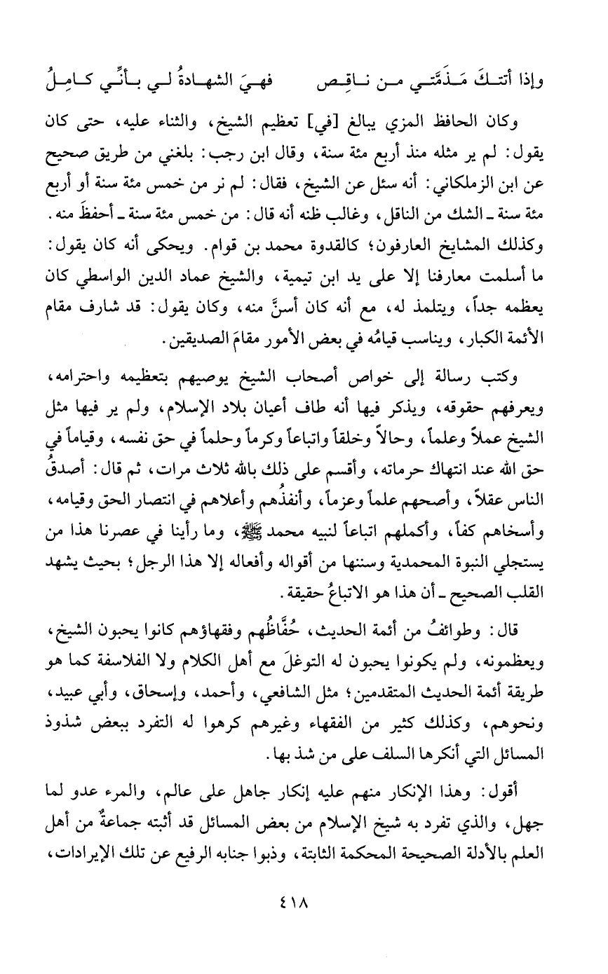قال: وطوائفُ من أئمة الحديث، حُفَّاظُهم وفقهاؤهم كانوا يحبون الشيخ، ويعظمونه، ولم يكونوا يحبون له التوغلَ مع أهل الكلام ولا الفلاسفة كما هو طريقة أئمة الحديث المتقدمين؛ مثل الشافعي، وأحمد، وإسحاق، وأبي عبيد، ونحوهم، وكذلك كثير من الفقهاء وغيرهم كرهوا له التفرد ببعض شذوذ المسائل التي أنكرها السلف على من شذ بها.