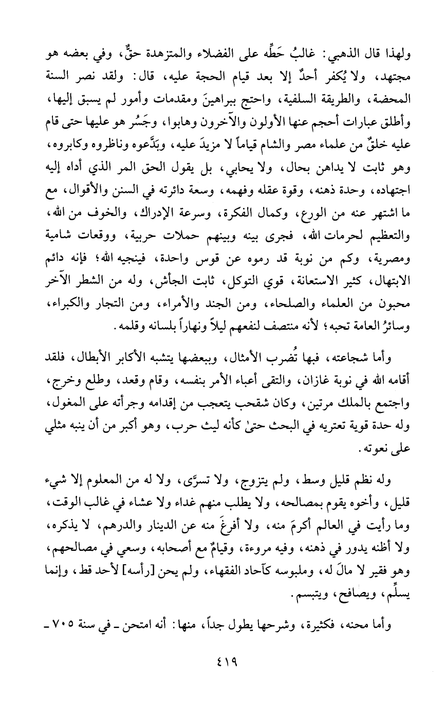 ولهذا قال الذهبي: غالبُ حَطَّه على الفضلاء والمتزهدة حقٌّ، وفي بعضه هو مجتهد، ولا يُكفر أحدٌ إلا بعد قيام الحجة عليه، قال: ولقد نصر السنة المحضة، والطريقة السلفية، واحتج ببراهينَ ومقدمات وأمور لم يسبق إليها، وأطلق عبارات أحجم عنها الأولون والآخرون وهابوا، وجَسُر هو عليها حتى قام عليه خلقٌ من علماء مصر والشام قيامًا لا مزيدَ عليه، وبَدَّعوه وناظروه وكابروه، وهو ثابت لا يداهن بحال، ولا يحابي، بل يقول الحق المر الذي أداه إليه اجتهاده، وحدة ذهنه، وقوة عقله وفهمه، وسعة دائرته في السنن والأقوال، مع ما اشتهر عنه من الورع، وكمال الفكرة، وسرعة الإدراك، والخوف من الله، والتعظيم لحرمات الله، فجرى بينه وبينهم حملات حربية، ووقعات شامية ومصرية، وكم من نوبة قد رموه عن قوس واحدة، فينجيه الله؛ فإنه دائم الابتهال، كثير الاستعانة، قوي التوكل، ثابت الجأش، وله من الشطر الآخر محبون من العلماء والصلحاء، ومن الجند والأمراء، ومن التجار والكبراء، وسائرُ العامة تحبه؛ لأنه منتصف لنفعهم ليلاً ونهارًا بلسانه وقلمه.