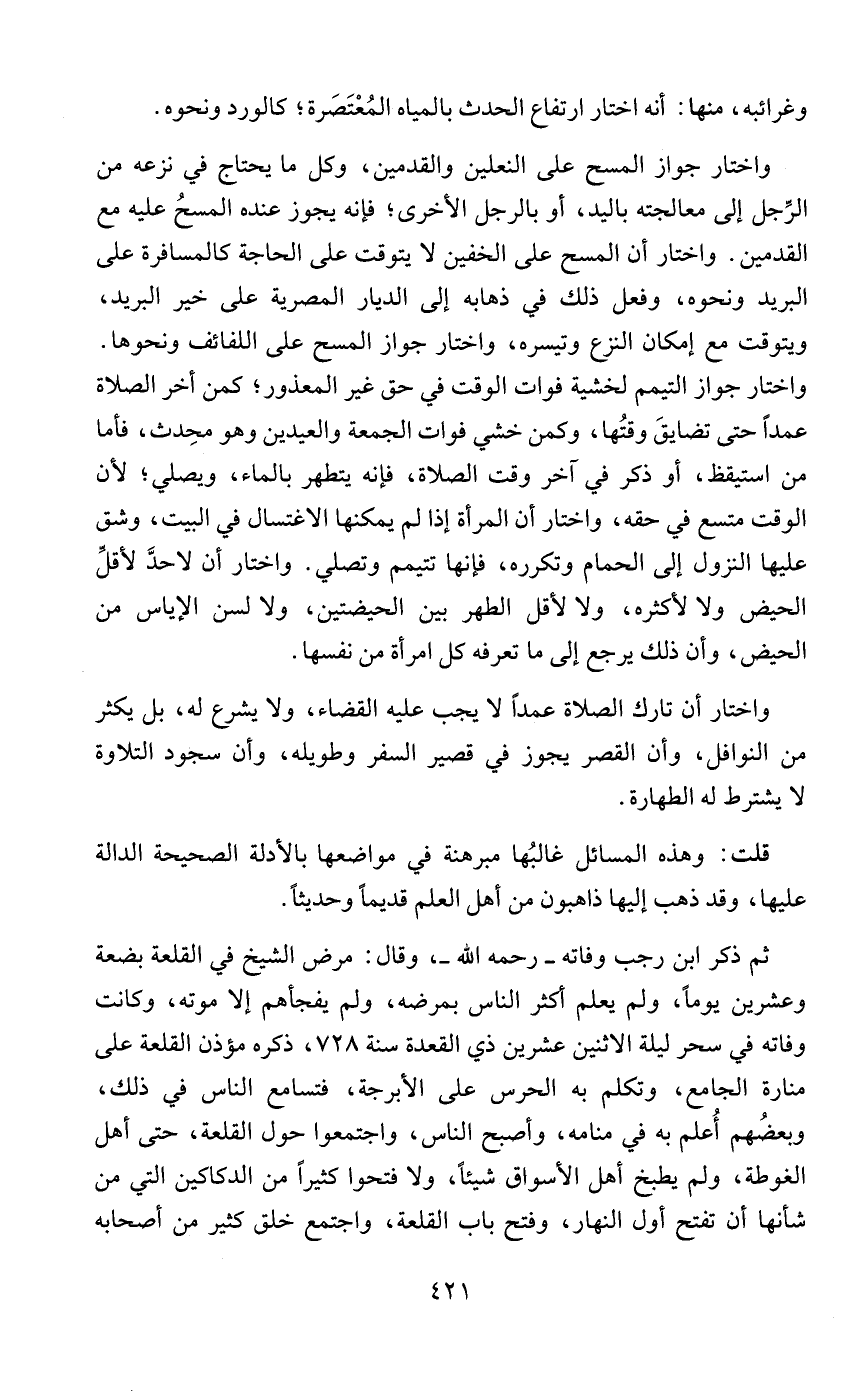 واختار جواز المسح على النعلين والقدمين، وكل ما يحتاج في نزعه من الرَّجل إلى معالجته باليد، أو بالرجل الأخرى؛ فإنه يجوز عنده المسحُ عليه مع القدمين. واختار أن المسح على الخفين لا يتوقت على الحاجة كالمسافرة على البريد ونحوه، وفعل ذلك في ذهابه إلى الديار المصرية على خير البريد، ويتوقت مع إمكان النزع وتيسره، واختار جواز المسح على اللفائف ونحوها. واختار جواز التيمم لخشية فوات الوقت في حق غير المعذور؛ كمن أخر الصلاة عمدًا حتى تضايقَ وقتُها، وكمن خشي فوات الجمعة والعيدين وهو محِدث، فأما من استيقظ، أو ذكر في آخر وقت الصلاة، فإنه يتطهر بالماء، ويصلي؛ لأن الوقت متسع في حقه، واختار أن المرأة إذا لم يمكنها الاغتسال في البيت، وشق عليها النزول إلى الحمام وتكرره، فإنها تتيمم وتصلي. واختار أن لا حدَّ لأقلَّ الحيض ولا لأكثره، ولا لأقل الطهر بين الحيضتين، ولا لسن الإياس من الحيض، وأن ذلك يرجع إلى ما تعرفه كل امرأة من نفسها.