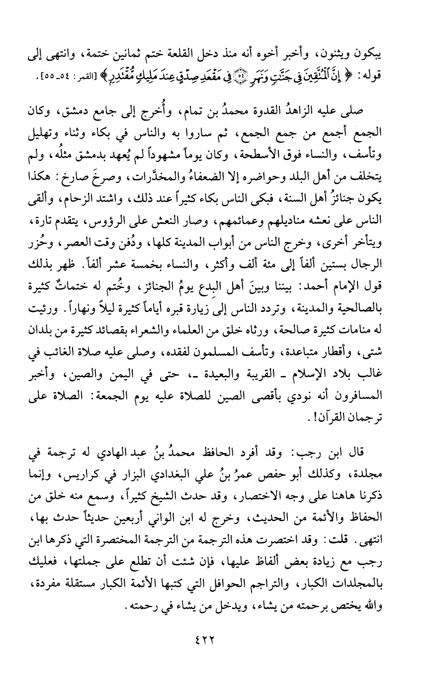يبكون ويثنون، وأخبر أخوه أنه منذ دخل القلعة ختم ثمانين ختمة، وانتهى إلى قوله: {إِنَّ الْمُتَّقِينَ فِي جَنَّاتٍ وَنَهَرٍ (54) فِي مَقْعَدِ صِدْقٍ عِنْدَ مَلِيكٍ مُقْتَدِرٍ} [القمر: 54، 55].