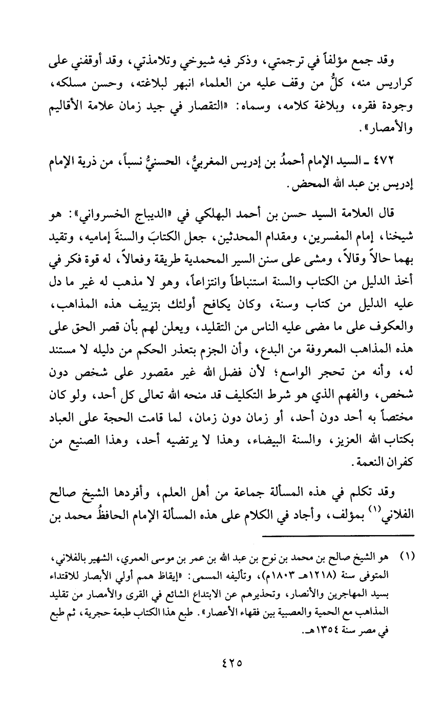 (¬1) هو الشيخ صالح بن محمد بن نوح بن عبد الله بن عمر بن موسى العمري، الشهير بالفلاني، المتوفى سنة (1218 هـ 1803 م)، وتأليفه المسمى: "إيقاظ همم أولي الأبصار للاقتداء بسيد المهاجرين والأنصار، وتحذيرهم عن الابتداع الشائع في القرى والأمصار من تقليد المذاهب مع الحمية والعصبية بين فقهاء الأعصار". طبع هذا الكتاب طبعة حجرية، ثم طبع في مصر سنة 1354 هـ.
