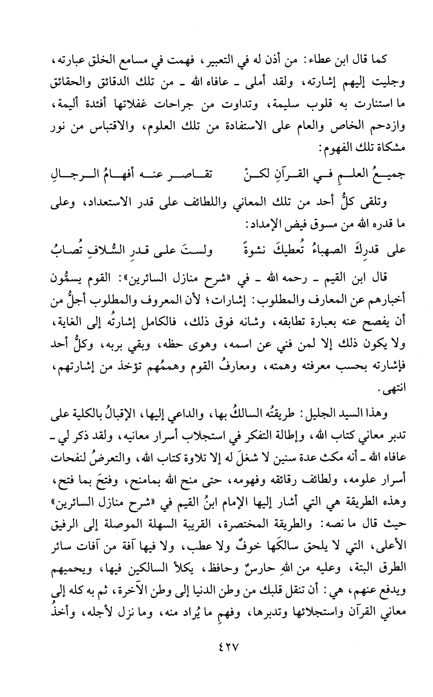 وهذا السيد الجليل: طريقتُه السالكُ بها، والداعي إليها، الإقبالُ بالكلية على تدبر معاني كتاب الله، وإطالة التفكر في استجلاب أسرار معانيه، ولقد ذكر لي - عافاه الله - أنه مكث عدة سنين لا شغلَ له إلا تلاوة كتاب الله، والتعرضُ لنفحات أسرار علومه، ولطائف رقائقه وفهومه، حتى منح الله بما منح، وفتحَ بما فتح، وهذه الطريقة هي التي أشار إليها الإمام ابنُ القيم في "شرح منازل السائرين" حيث قال ما نصه: والطريقة المختصرة، القريبة السهلة الموصلة إلى الرفيق الأعلى، التي لا يلحق سالكَها خوفٌ ولا عطب، ولا فيها آفة من آفات سائر الطرق البتة، وعليه من اللهِ حارسٌ وحافظ، يكلأ السالكين فيها، ويحميهم ويدفع عنهم، هي: أن تنقل قلبك من وطن الدنيا إلى وطن الآخرة، ثم به كله إلى معاني القرآن واستجلائها وتدبرها، وفهمِ ما يُراد منه، وما نزل لأجله، وأخذُ
