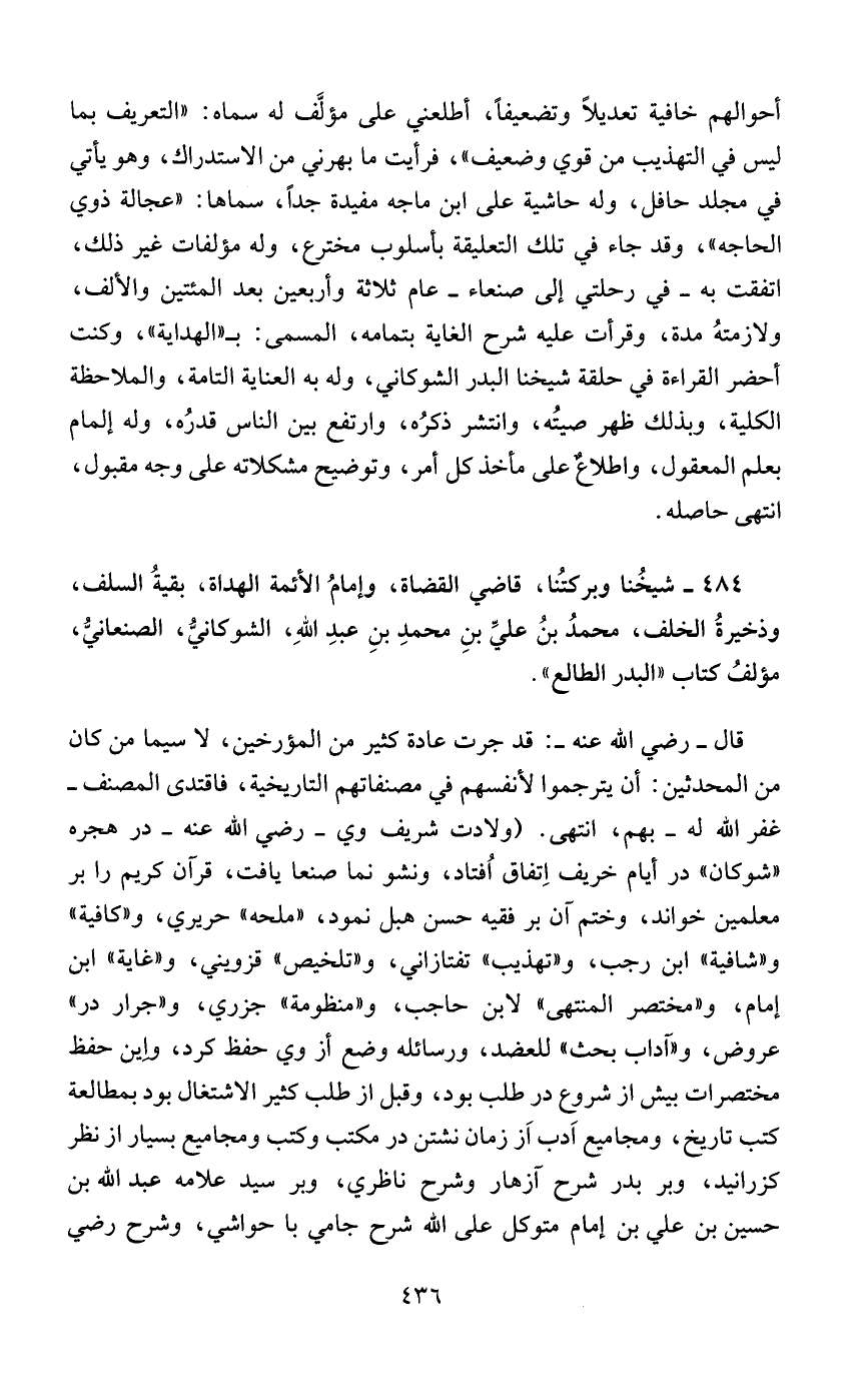 484 - شيخُنا وبركتُنا، قاضي القضاة، وإمامُ الأئمة الهداة، بقيةُ السلف، وذخيرةُ الخلف، محمدُ بنُ عليِّ بنِ محمدِ بنِ عبدِ اللهِ، الشوكانيُّ، الصنعانيُّ، مؤلفُ كتاب "البدر الطالع".