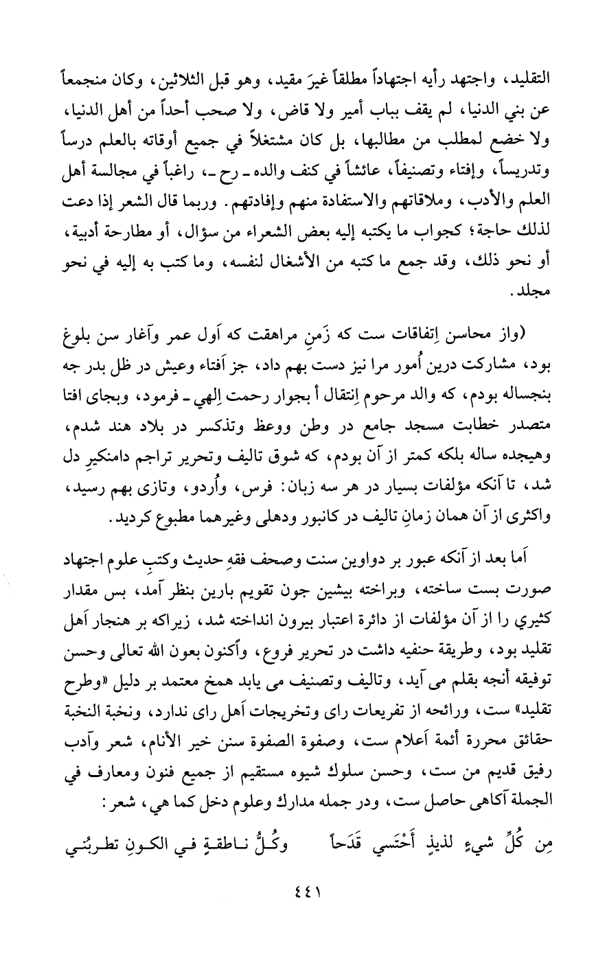 (واز محاسن اِتفاقات ست كه زَمنِ مراهقت كه اَول عمر وآغار سن بلوغ بود، مشاركت درين اُمور مرا نيز دست بهم داد، جز اَفتاء وعيش در ظل بدر جه بنجساله بودم، كه والد مرحوم اِنتقال أبجوار رحمت اِلهي - فرمود، وبجاى افتا متصدر خطابت مسجد جامع در وطن ووعظ وتذكسر در بلاد هند شدم، وهيجده ساله بلكه كمتر از آن بودم، كه شوق تاليف وتحرير تراجم دامنكيرِ دل شد، تا اَنكه مؤلفات بسيار در هر سه زبان: فرس، واُردو، وتازى بهم رسيد، واكثرى از آن همان زمانِ تاليف در كانبور ودهلى وغيرهما مطبوع كرديد.