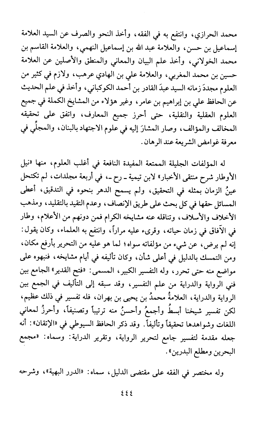 محمد الحرازي، وانتفع به في الفقه، وأخذ النحو والصرف عن السيد العلامة إسماعيل بن حسن، والعلامة عبد الله بن إسماعيل النهمي، والعلامة القاسم بن محمد الخولاني، وأخذ علم البيان والمعاني والمنطق والأصلين عن العلامة حسين بن محمد المغربي، والعلامة علي بن الهادي عرهب، ولازم في كثير من العلوم مجددَ زمانه السيد عبدَ القادر بن أحمد الكوكباني، وأخذ في علم الحديث عن الحافظ علي بن إبراهيم بن عامر، وغير هؤلاء من المشايخ الكملة في جميع العلوم العقلية والنقلية، حتى أحرز جميع المعارف، واتفق على تحقيقه المخالف والمؤالف، وصار المشارَ إليه في علوم الاجتهاد بالبنان، والمجلِّي في معرفة غوامض الشريعة عند الرهان.