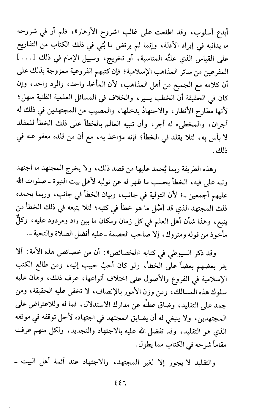 وقد ذكر السيوطي في كتابه "الخصائص": أن من خصائص هذه الأمة: ألا يقر بعضهم بعضًا على الخطأ، ولو كان أحبَّ حبيب إليه، ومن طالع الكتب الإسلامية في الفروع والأصول على اختلاف أنواعها، عرف ذلك، وهان عليه سلوك هذه المسالك، ومن وزن الأمور بالإنصاف، لا تخفى عليه الحقيقة، ومن جمد على التقليد، وضاق عطنُه عن مدارك الاستدلال، فما له وللاعتراض على المجتهدين، ولا ينبغي له أن يضايق المجتهد في اجتهاده لأجل توقفه في موقفه الذي هو التقليد، وقد تفضل الله عليه بالاجتهاد والتجديد، ولكل منهم عرفت مقامًا شرحه في الكتاب مما يطول.