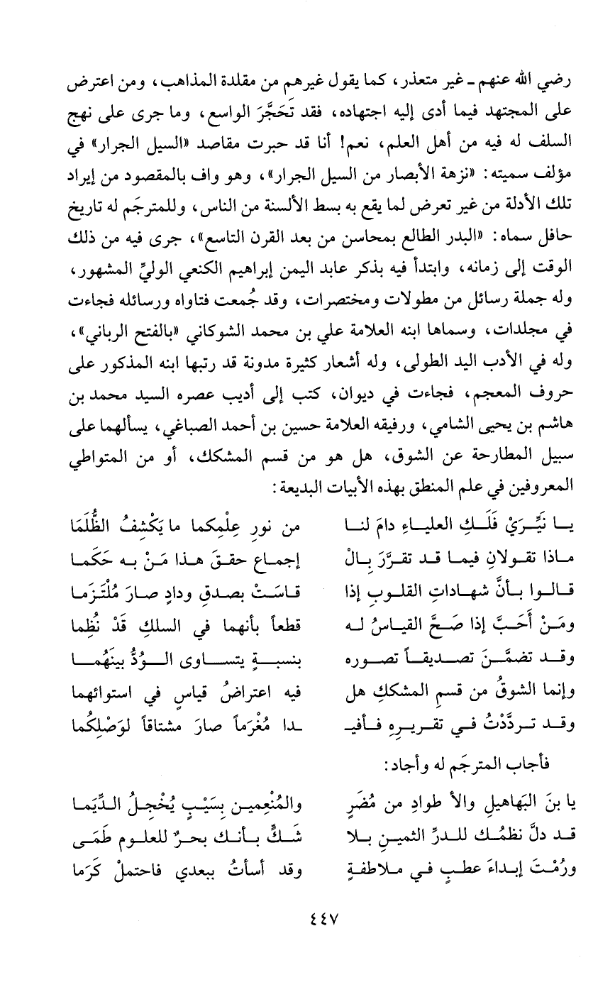 رضي الله عنهم - غير متعذر، كما يقول غيرهم من مقلدة المذاهب، ومن اعترض على المجتهد فيما أدى إليه اجتهاده، فقد تَحَجَّرَ الواسع، وما جرى على نهج السلف له فيه من أهل العلم، نعم! أنا قد حبرت مقاصد "السيل الجرار" في مؤلف سميته: "نزهة الأبصار من السيل الجرار"، وهو واف بالمقصود من إيراد تلك الأدلة من غير تعرض لما يقع به بسط الألسنة من الناس، وللمترجَم له تاريخ حافل سماه: "البدر الطالع بمحاسن من بعد القرن التاسع"، جرى فيه من ذلك الوقت إلى زمانه، وابتدأ فيه بذكر عابد اليمن إبراهيم الكنعي الوليِّ المشهور، وله جملة رسائل من مطولات ومختصرات، وقد جُمعت فتاواه ورسائله فجاءت في مجلدات، وسماها ابنه العلامة علي بن محمد الشوكاني "بالفتح الرباني"، وله في الأدب اليد الطولى، وله أشعار كثيرة مدونة قد رتبها ابنه المذكور على حروف المعجم، فجاءت في ديوان، كتب إلى أديب عصره السيد محمد بن هاشم بن يحيى الشامي، ورفيقه العلامة حسين بن أحمد الصباغي، يسألهما على سبيل المطارحة عن الشوق، هل هو من قسم المشكك، أو من المتواطي المعروفين في علم المنطق بهذه الأبيات البديعة: