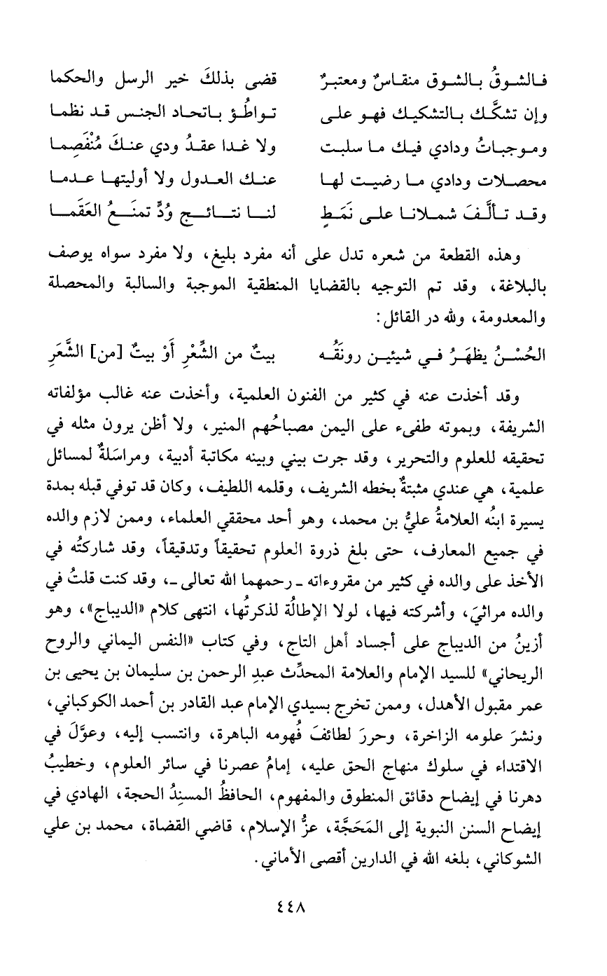 وهذه القطعة من شعره تدل على أنه مفرد بليغ، ولا مفرد سواه يوصف بالبلاغة، وقد تم التوجيه بالقضايا المنطقية الموجبة والسالبة والمحصلة والمعدومة، ولله در القائل: