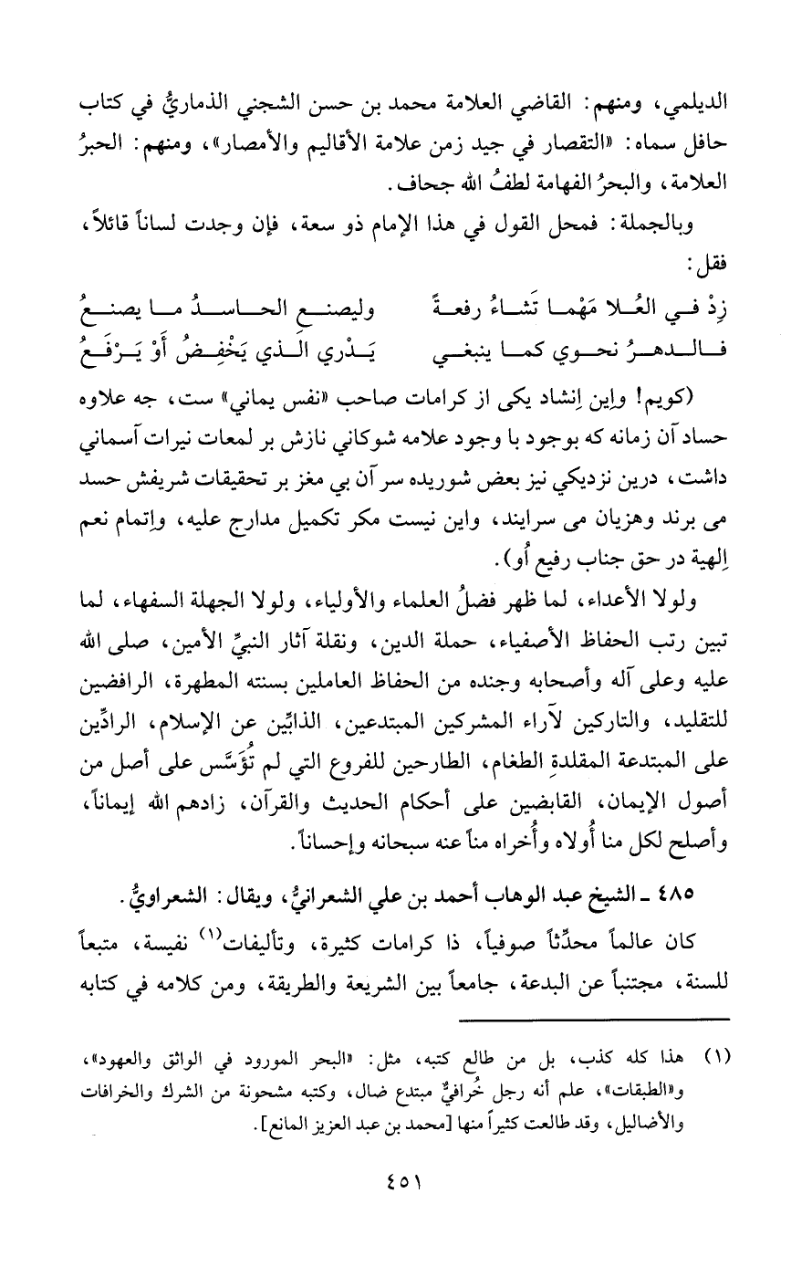 (¬1) هذا كله كذب، بل من طالع كتبه، مثل: "البحر المورود في الواثق والعهود"، و"الطبقات"، علم أنه رجل خُرافيٌّ مبتدع ضال، وكتبه مشحونة من الشرك والخرافات والأضاليل، وقد طالعت كثيرًا منها [محمد بن عبد العزيز المانع].