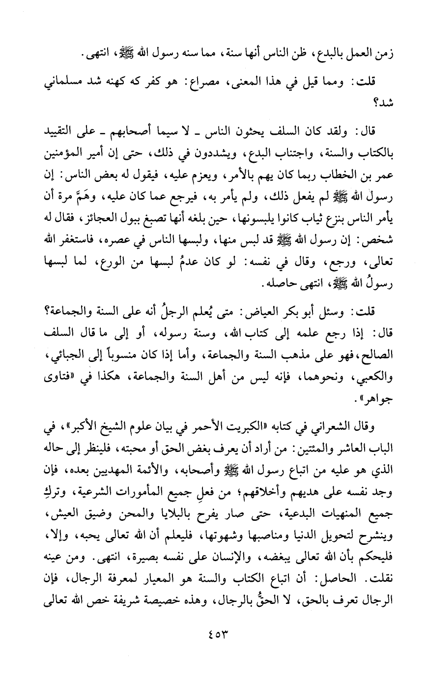 قال: ولقد كان السلف يحثون الناس - لا سيما أصحابهم - على التقييد بالكتاب والسنة، واجتناب البدع، ويشددون في ذلك، حتى إن أمير المؤمنين عمر بن الخطاب ربما كان يهم بالأمر، ويعزم عليه، فيقول له بعض الناس: إن رسول الله - صلى الله عليه وسلم - لم يفعل ذلك، ولم يأمر به، فيرجع عما كان عليه، وهَمَّ مرة أن يأمر الناس بنزع ثياب كانوا يلبسونها، حين بلغه أنها تصبغ ببول العجائز، فقال له شخص: إن رسول الله - صلى الله عليه وسلم - قد لبس منها، ولبسها الناس في عصره، فاستغفر الله تعالى، ورجع، وقال في نفسه: لو كان عدمُ لبسها من الورع، لما لبسها رسولُ الله - صلى الله عليه وسلم -، انتهى حاصله.