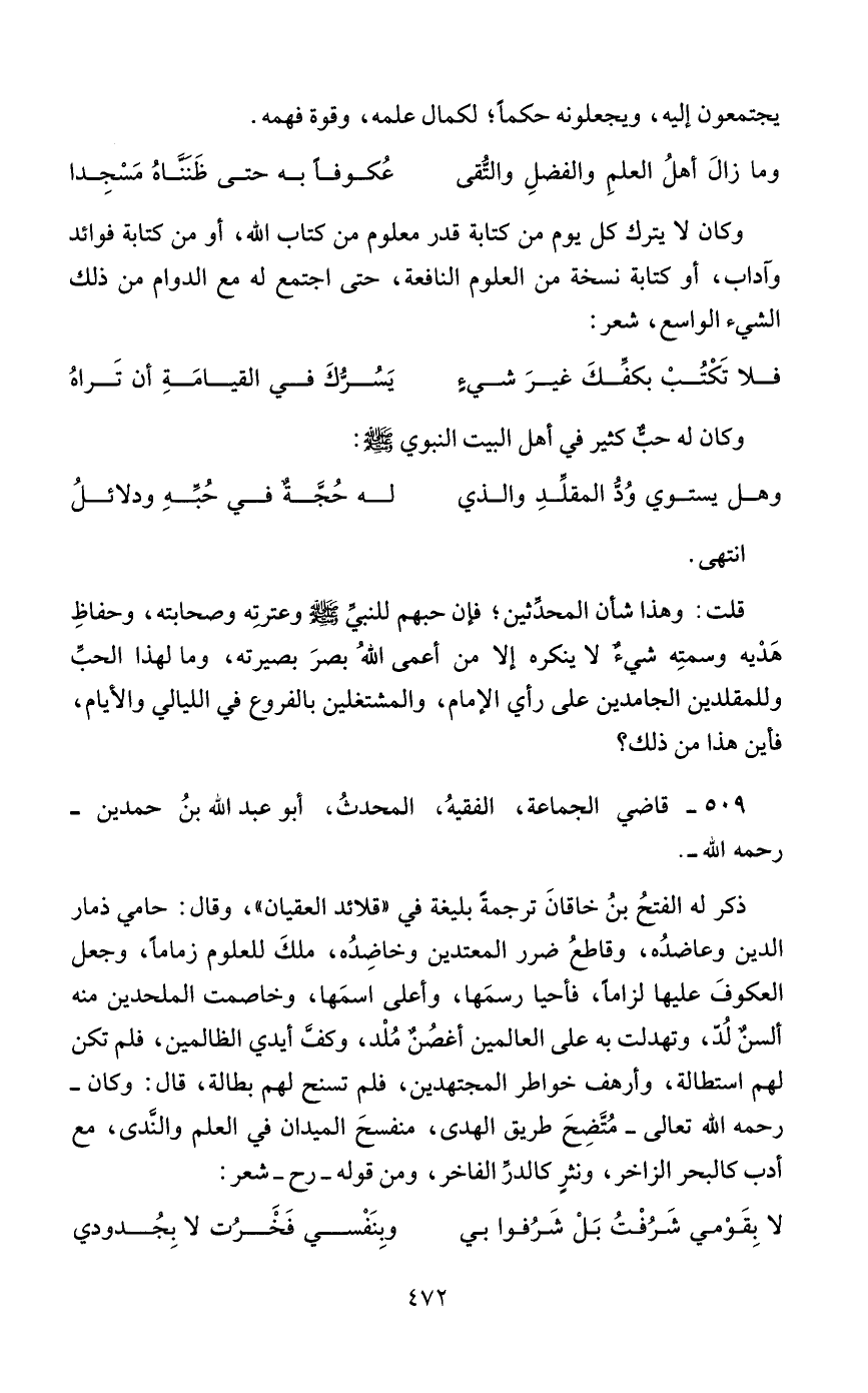 قلت: وهذا شأن المحدِّثين؛ فإن حبهم للنبيِّ - صلى الله عليه وسلم - وعترتِه وصحابته، وحفاظِ هَدْيه وسمتِه شيءٌ لا ينكره إلا من أعمى اللهُ بصرَ بصيرته، وما لهذا الحبِّ وللمقلدين الجامدين على رأي الإمام، والمشتغلين بالفروع في الليالي والأيام، فأين هذا من ذلك؟