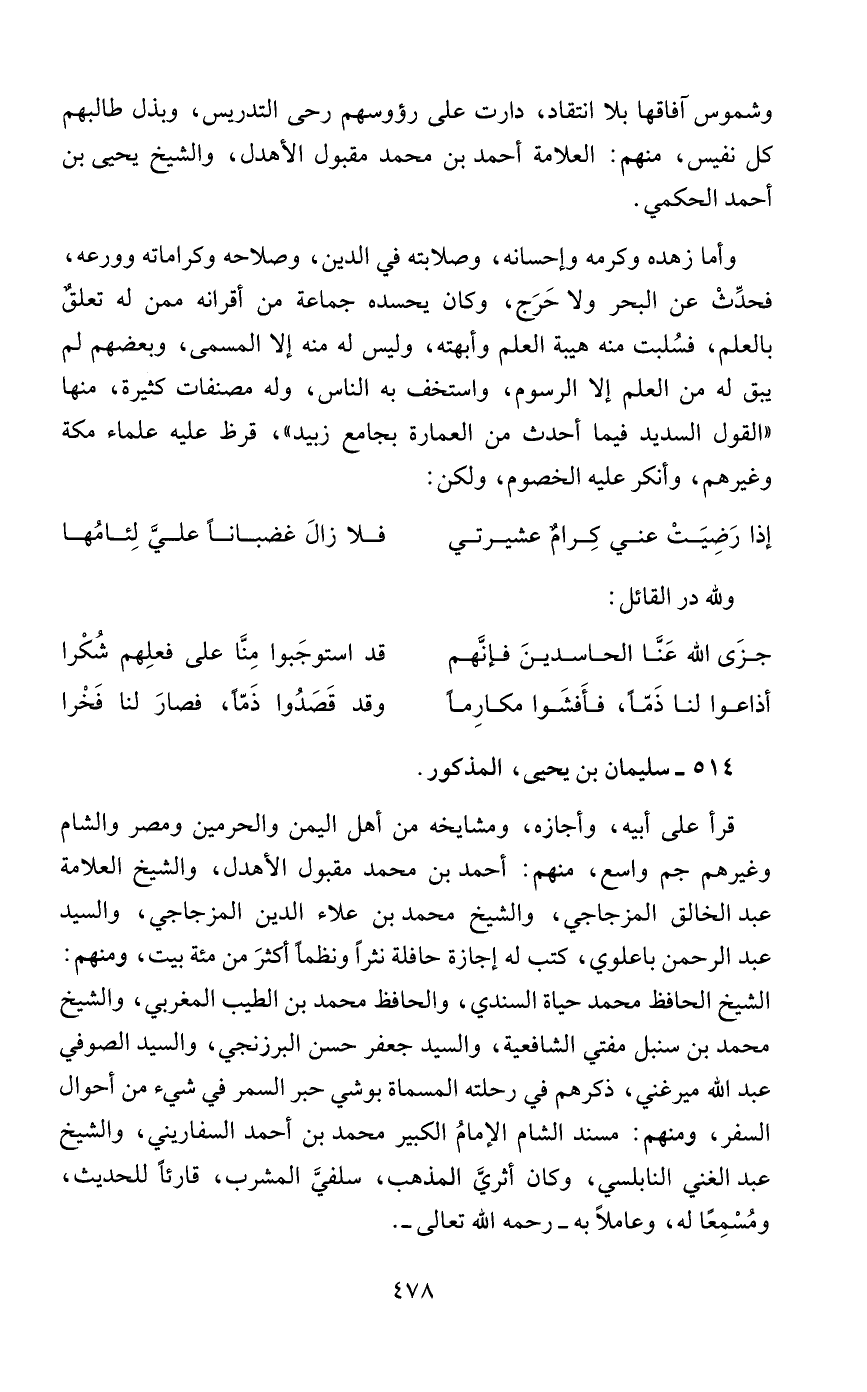 وشموس آفاقها بلا انتقاد، دارت على رؤوسهم رحى التدريس، وبذل طالبهم كل نفيس، منهم: العلامة أحمد بن محمد مقبول الأهدل، والشيخ يحيى بن أحمد الحكمي.