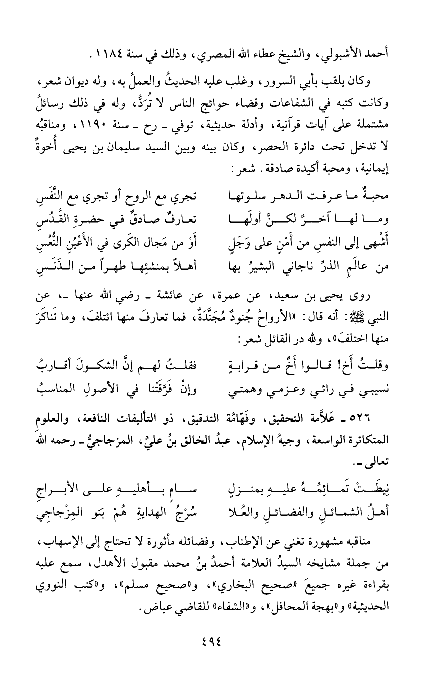وكان يلقب بأبي السرور، وغلب عليه الحديثُ والعملُ به، وله ديوان شعر، وكانت كتبه في الشفاعات وقضاء حوائج الناس لا تُرَدُّ، وله في ذلك رسائلُ مشتملة على آيات قرآنية، وأدلة حديثية، توفي - رح - سنة 1190، ومناقبُه لا تدخل تحت دائرة الحصر، وكان بينه وبين السيد سليمان بن يحيى أُخوةٌ إيمانية، ومحبة أكيدة صادقة. شعر: