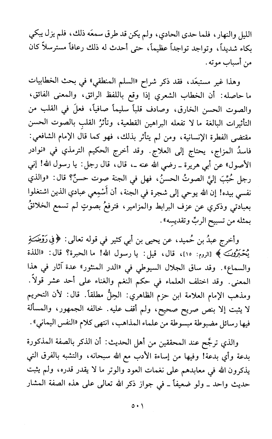 وأخرج عبدُ بن حُميد، عن يحيى بن أبي كثير في قوله تعالى: {فِي رَوْضَةٍ يُحْبَرُونَ} [الروم: 15]، قال، قيل: يا رسول الله! ما الحبرة؟ قال: "اللذة والسماع". وقد ساق الجلال السيوطي في "الدر المنثور" عدة آثار في هذا المعنى. وقد اختلف العلماء في حكم النغم والغناء على أحد عشر قولًا. ومذهب الإمام العلامة ابن حزم الظاهري: الحِلُّ مطلقًا. قال: لأن التحريم لا يثبت إلا بنص صريح صحيح، ولم أقف عليه. خالفه الجمهور، والمسألة فيها رسائل مضبوطة مبسوطة من علماء المذاهب، انتهى كلام "النفس اليماني".