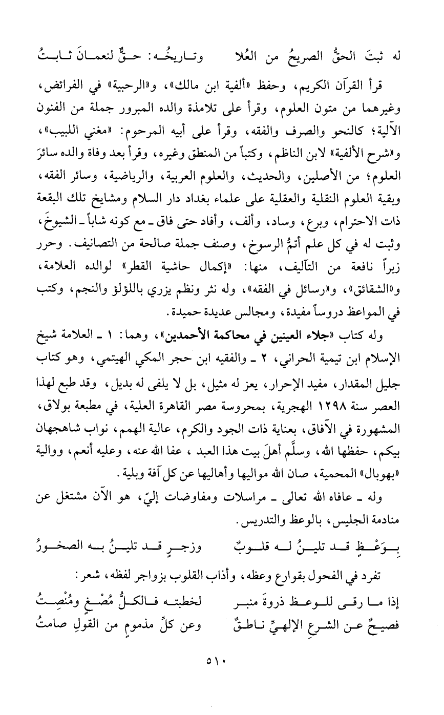 وله - عافاه الله تعالى - مراسلات ومفاوضات إليّ، هو الآن مشتغل عن منادمة الجليس، بالوعظ والتدريس.
