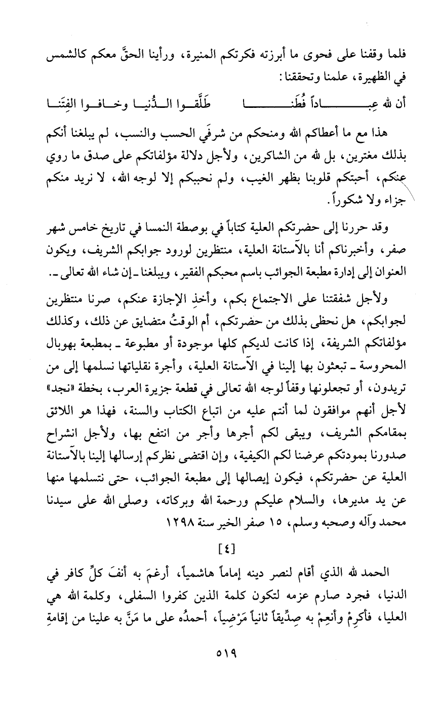 ولأجل شفقتنا على الاجتماع بكم، وأخذِ الإجازة عنكم، صرنا منتظرين لجوابكم، هل نحظى بذلك من حضرتكم، أم الوقتُ متضايق عن ذلك، وكذلك مؤلفاتكم الشريفة، إذا كانت لديكم كلها موجودة أو مطبوعة - بمطبعة بهوبال المحروسة - تبعثون بها إلينا في الآستانة العلية، وأجرة نقلياتها نسلمها إلى من تريدون، أو تجعلونها وقفًا لوجه الله تعالى في قطعة جزيرة العرب، بخطة "نجد" لأجل أنهم موافقون لما أنتم عليه من اتباع الكتاب والسنة، فهذا هو اللائق بمقامكم الشريف، ويبقى لكم أجرها وأجر من انتفع بها، ولأجل انشراح صدورنا بمودتكم عرضنا لكم الكيفية، وإن اقتضى نظركم إرسالها إلينا بالآستانة العلية عن حضرتكم، فيكون إيصالها إلى مطبعة الجوائب، حتى نتسلمها منها عن يد مديرها، والسلام عليكم ورحمة الله وبركاته، وصلى الله على سيدنا محمد وآله وصحبه وسلم، 15 صفر الخير سنة 1298