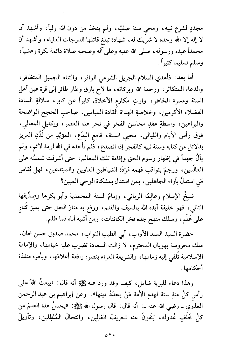 حضرة السيد السند الأواب، أبي الطيب النواب، محمد صديق حسن خان، ملك محروسة بهوبال المحترم، لا زالت السعادة تضرب عليه خيامها، والإمامة الإسلامية تُلقي إليه زمامها، والشريعة الغراء بنصره رافعة أعلامَها، وبأمره منفذة أحكامها.