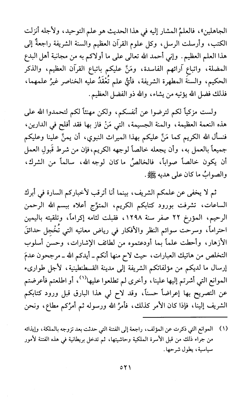 ثم لا يخفى عن علمكم الشريف، بينما أنا أترقب لأخباركم السارة في أبرك الساعات، تشرفت بورود كتابكم الكريم، المتوَّج أعلاه ببِسْمِ اللَّهِ الرَّحْمَنِ الرَّحِيمِ، المؤرخ 22 صفر سنة 1298، فقبلت لثامه إكرامًا، وتلقيته باليمين احترامًا، وسرحت سوائم النظر والأفكار في رياض معانيه التي تُخْجِل حدائقَ الأزهار، وأحطت علمًا بما أودعتموه من لطائف الإشارات، وحسن أسلوب التخلص من هاتيك العبارات، حيث لاح منها أنكم - أيدكم الله - مرجحون عدمَ إرسال ما لديكم من مؤلفاتكم الشريفة إلى مدينة القسطنطينية، لأجل طوارىء الموانع التي أشرتم إليها علينا، وأخرى لم تطلعوا عليها (¬1)، أو اطلعتم فأعرضتم عن التصريح بها إعراضًا حسنًا، وقد لاح لي هذا البارق قبل ورود كتابكم الشريف إلينا، فإذا كان الأمر كذلك، فأمرُ الله ورسوله ثم أمرُكم مطاع، ونحن
