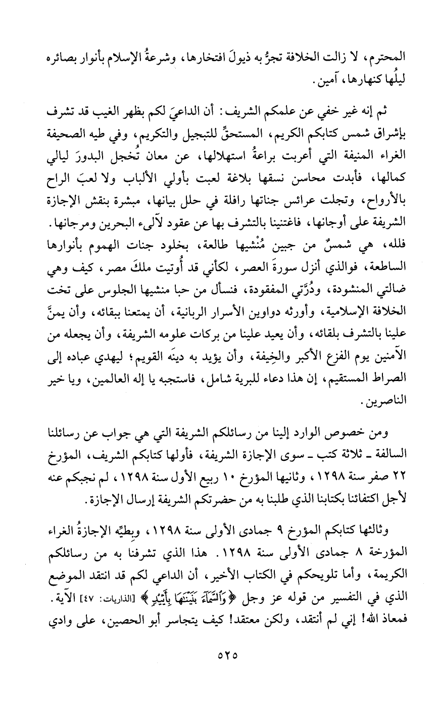 ومن خصوص الوارد إلينا من رسائلكم الشريفة التي هي جواب عن رسائلنا السالفة - ثلاثة كتب - سوى الإجازة الشريفة، فأولها كتابكم الشريف، المؤرخ 22 صفر سنة 1298، وثانيها المؤرخ 10 ربيع الأول سنة 1298، لم نجبكم عنه لأجل اكتفائنا بكتابنا الذي طلبنا به من حضرتكم الشريفة إرسال الإجازة.
