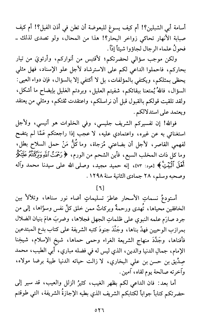 فوالله! إن تفسيركم الشريف جليسي، وفي الخلوات هو أنيسي، ولأجل استغنائي به عن غيره، واعتمادي عليه، لا عجب إذا راجعتكم عَمَّا لم يتضح لفهمي القاصر، لأجل أن بضاعتي مُزجاة، وما كُلُّ مَنْ حمل السلاح بطل، وما كل ذات المخلب السبع، فأين الشحم من الورم، {رَحْمَتُ اللَّهِ وَبَرَكَاتُهُ عَلَيْكُمْ أَهْلَ الْبَيْتِ} [هود: 73]، إنه حميد مجيد، وصلى الله على سيدنا محمد وآله وصحبه وسلم، 28 جمادى الثانية سنة 1298.
