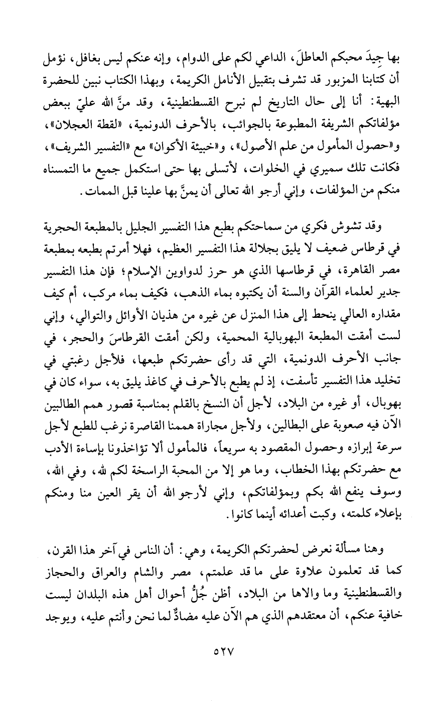 وقد تشوش فكري من سماحتكم بطبع هذا التفسير الجليل بالمطبعة الحجرية في قرطاس ضعيف لا يليق بجلالة هذا التفسير العظيم، فهلا أمرتم بطبعه بمطبعة مصر القاهرة، في قرطاسها الذي هو حرز لدواوين الإسلام؛ فإن هذا التفسير جدير لعلماء القرآن والسنة أن يكتبوه بماء الذهب، فكيف بماء مركب، أم كيف مقداره العالي ينحط إلى هذا المنزل عن غيره من هذيان الأوائل والتوالي، وإني لست أمقت المطبعة البهوبالية المحمية، ولكن أمقت القرطاسَ والحجر، في جانب الأحرف الدونمية، التي قد رأى حضرتكم طبعها، فلأجل رغبتي في تخليد هذا التفسير تأسفت، إذ لم يطبع بالأحرف في كاغذ يليق به، سواء كان في بهوبال، أو غيره من البلاد، لأجل أن النسخ بالقلم بمناسبة قصور همم الطالبين الآن فيه صعوبة على البطالين، ولأجل مجاراة هممنا القاصرة نرغب للطبع لأجل سرعة إبرازه وحصول المقصود به سريعًا، فالمأمول ألا تؤاخذونا بإساءة الأدب مع حضرتكم بهذا الخطاب، وما هو إلا من المحبة الراسخة لكم لله، وفي الله، وسوف ينفع الله بكم وبمؤلفاتكم، وإني لأرجو الله أن يقر العين منا ومنكم بإعلاء كلمته، وكبت أعدائه أينما كانوا.