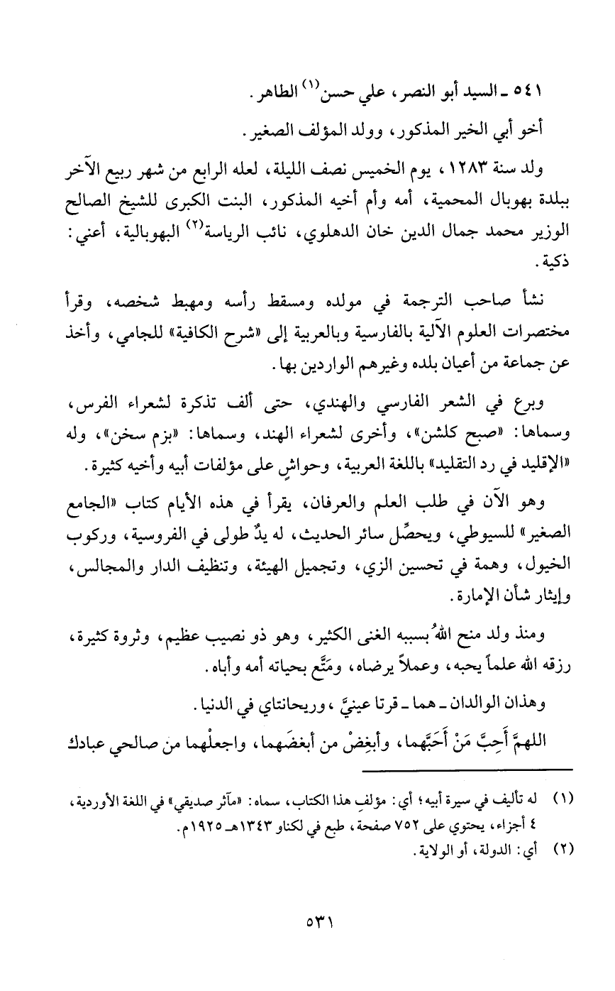 (¬1) له تأليف في سيرة أبيه؛ أي: مؤلفِ هذا الكتاب، سماه: "مآثر صديقي" في اللغة الأوردية، 4 أجزاء، يحتوي على 752 صفحة، طبع في لكناو 1343 هـ 1925 م.
