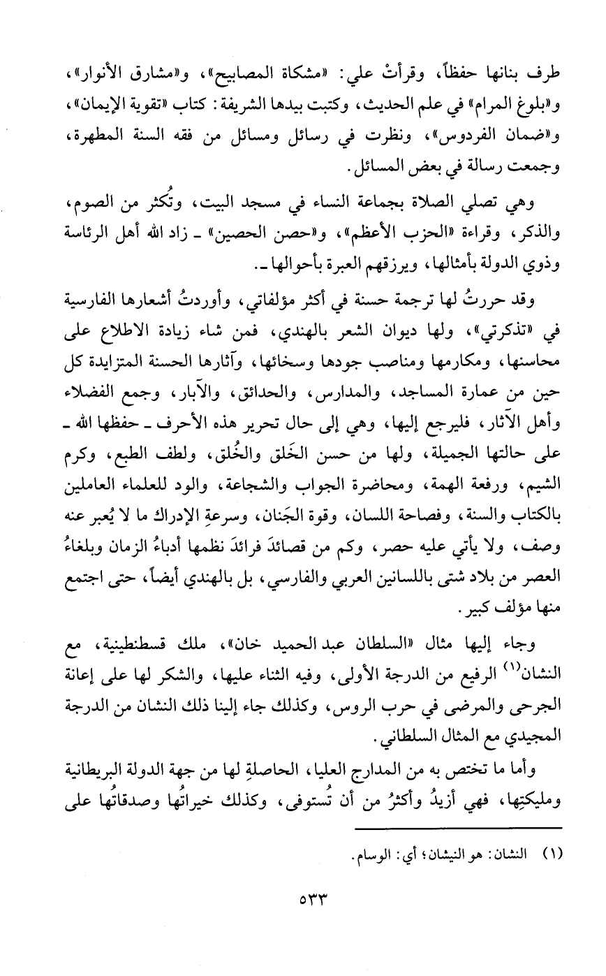 وجاء إليها مثال "السلطان عبد الحميد خان"، ملك قسطنطينية، مع النشان (¬1) الرفيع من الدرجة الأولى، وفيه الثناء عليها، والشكر لها على إعانة الجرحى والمرضى في حرب الروس، وكذلك جاء إلينا ذلك النشان من الدرجة المجيدي مع المثال السلطاني.
