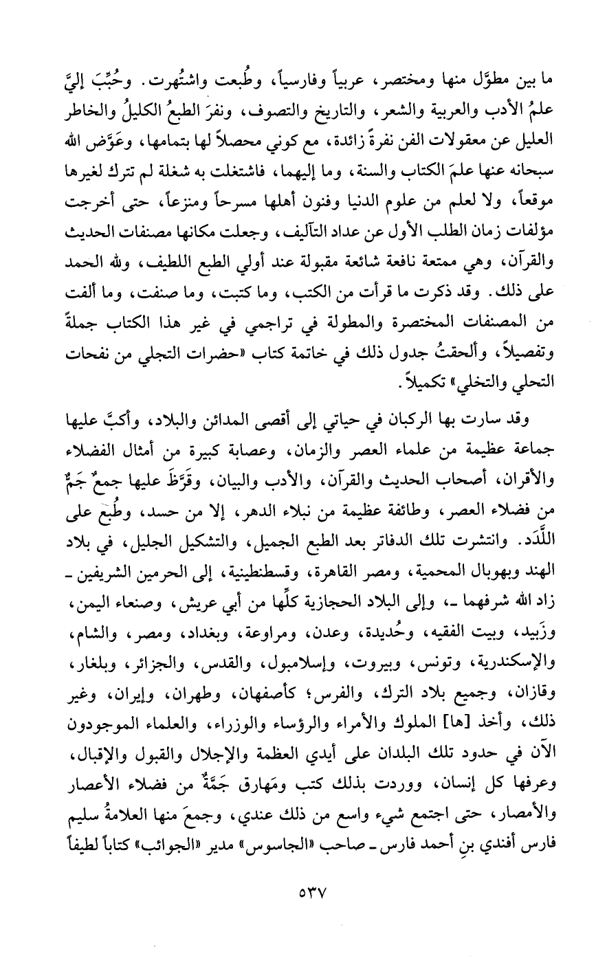ما بين مطوَّل منها ومختصر، عربيًا وفارسيًا، وطُبعت واشتُهرت. وحُبِّبَ إليَّ علمُ الأدب والعربية والشعر، والتاريخ والتصوف، ونفرَ الطبعُ الكليلُ والخاطر العليل عن معقولات الفن نفرةً زائدة، مع كوني محصلًا لها بتمامها، وعَوَّض الله سبحانه عنها علمَ الكتاب والسنة، وما إليهما، فاشتغلت به شغلة لم تترك لغيرها موقعًا، ولا لعلم من علوم الدنيا وفنون أهلها مسرحًا ومنزعًا، حتى أخرجت مؤلفات زمان الطلب الأول عن عداد التآليف، وجعلت مكانها مصنفات الحديث والقرآن، وهي ممتعة نافعة شائعة مقبولة عند أولي الطبع اللطيف، ولله الحمد على ذلك. وقد ذكرت ما قرأت من الكتب، وما كتبت، وما صنفت، وما ألفت من المصنفات المختصرة والمطولة في تراجمي في غير هذا الكتاب جملةً وتفصيلًا، وألحقتُ جدول ذلك في خاتمة كتاب "حضرات التجلي من نفحات التحلي والتخلي" تكميلًا.
