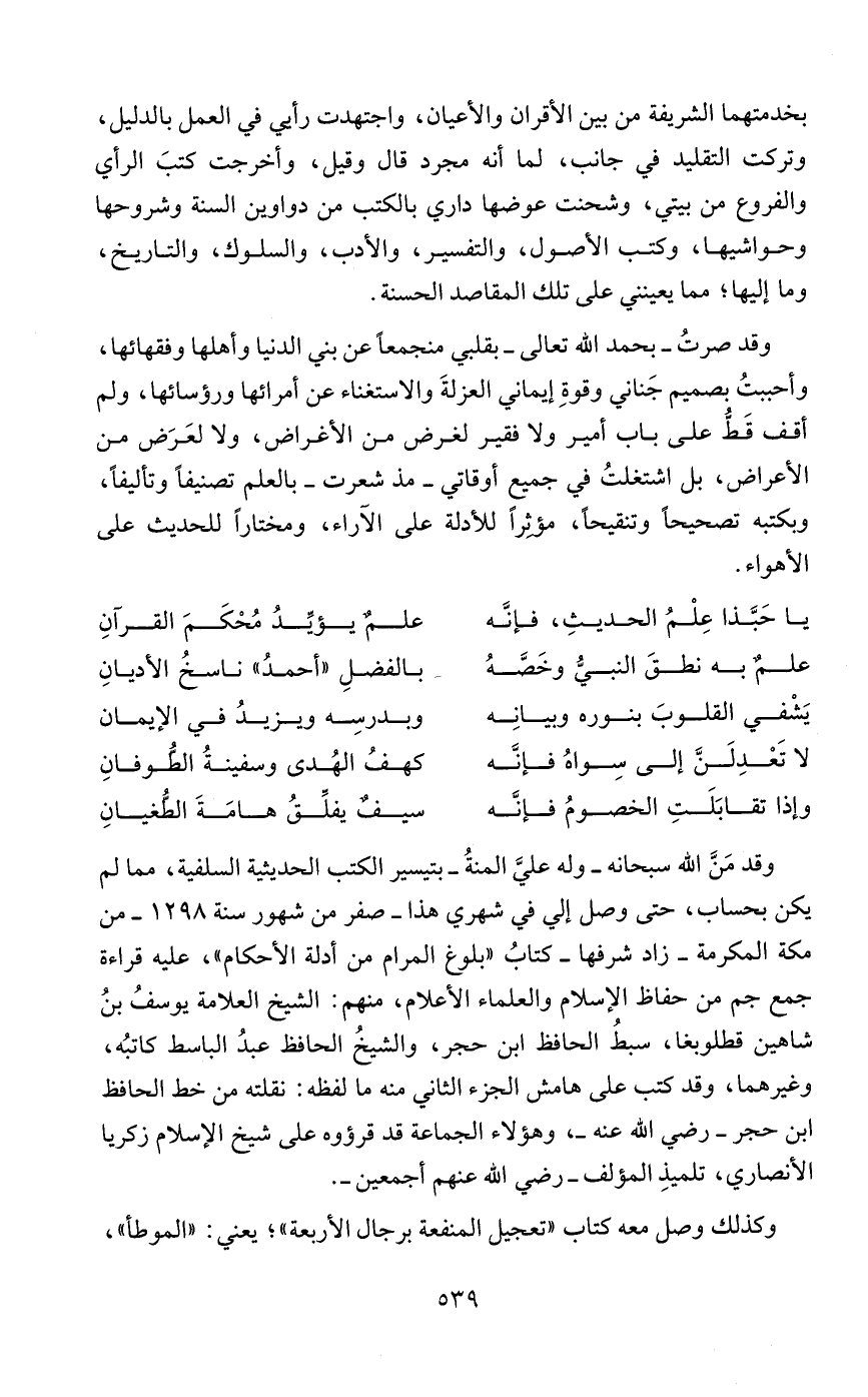 بخدمتهما الشريفة من بين الأقران والأعيان، واجتهدت رأيي في العمل بالدليل، وتركت التقليد في جانب، لما أنه مجرد قال وقيل، وأخرجت كتبَ الرأي والفروع من بيتي، وشحنت عوضها داري بالكتب من دواوين السنة وشروحها وحواشيها، وكتب الأصول، والتفسير، والأدب، والسلوك، والتاريخ، وما إليها؛ مما يعينني على تلك المقاصد الحسنة.