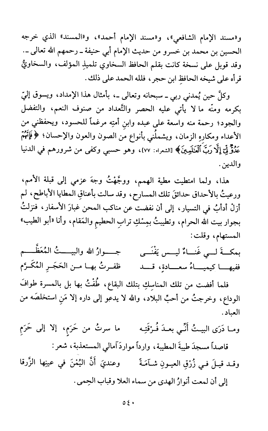 هذا، ولما امتطيت مطية الهمم، ووجَّهْتُ وجهَ عزمي إلى قبلة الأمم، ورعيتُ بالأحداق حدائقَ تلك المسارح، وقد سالت بأعناقِ المطايا الأباطح، لم أزلْ أدأبُ في التسيار، إلى أن نفضت عن مناكب المحن غبارَ الأسفار، فنزلتُ بجوار بيت الله الحرام، وتطيبتُ بمِسْكِ ترابِ الحطيمِ والمَقام، وأنا "أبو الطيب" المستهام، وقلت: