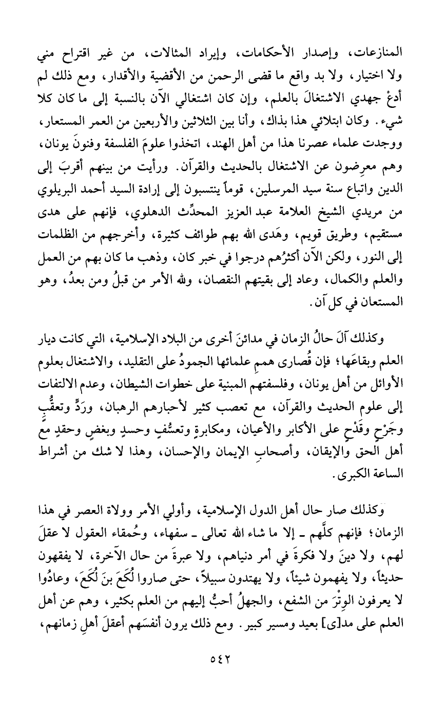 المنازعات، وإصدار الأحكامات، وإيراد المثالات، من غير اقتراح مني ولا اختيار، ولا بد واقع ما قضى الرحمن من الأقضية والأقدار، ومع ذلك لم أدعْ جهدي الاشتغالَ بالعلم، وإن كان اشتغالي الآن بالنسبة إلى ما كان كلا شيء. وكان ابتلائي هذا بذاك، وأنا بين الثلاثين والأربعين من العمر المستعار، ووجدت علماء عصرنا هذا من أهل الهند، اتخذوا علومَ الفلسفة وفنونَ يونان، وهم معرِضون عن الاشتغال بالحديث والقرآن. ورأيت من بينهم أقربَ إلى الدين واتباع سنة سيد المرسلين، قومًا ينتسبون إلى إرادة السيد أحمد البريلوي من مريدي الشيخ العلامة عبد العزيز المحدِّث الدهلوي، فإنهم على هدى مستقيم، وطريق قويم، وهَدى الله بهم طوائف كثيرة، وأخرجهم من الظلمات إلى النور، ولكن الآن اكثرُهم درجوا في خبر كان، وذهب ما كان بهم من العمل والعلم والكمال، وعاد إلى بقيتهم النقصان، ولله الأمر من قبلُ ومن بعدُ، وهو المستعان في كل آن.