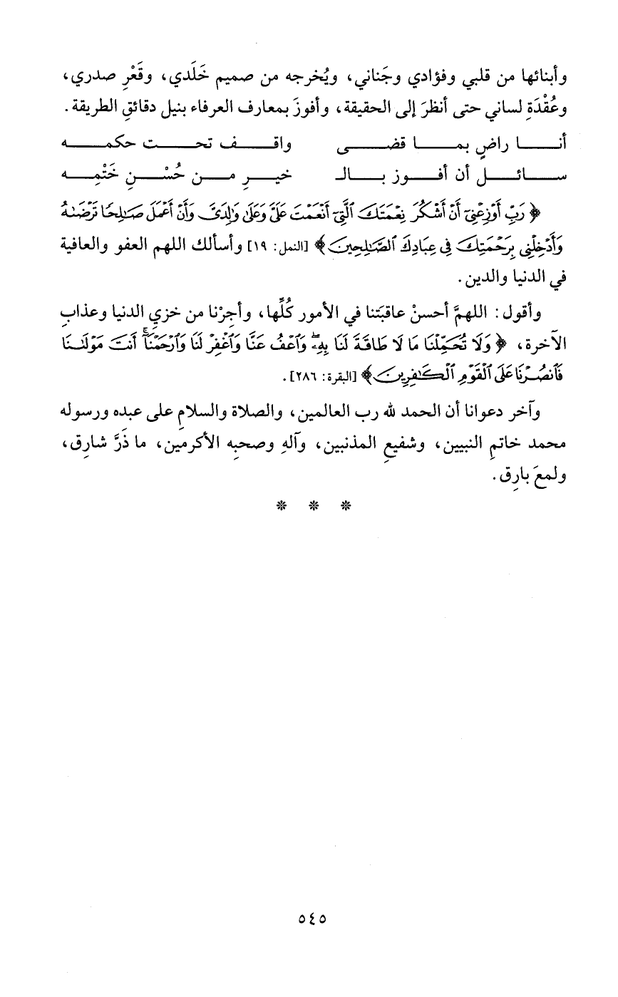 وأبنائها من قلبي وفؤادي وجَناني، ويُخرجه من صميم خَلَدي، وقَعْرِ صدري، وعُقْدَةِ لساني حتى أنظرَ إلى الحقيقة، وأفوزَ بمعارف العرفاء بنيل دقائقِ الطريقة.