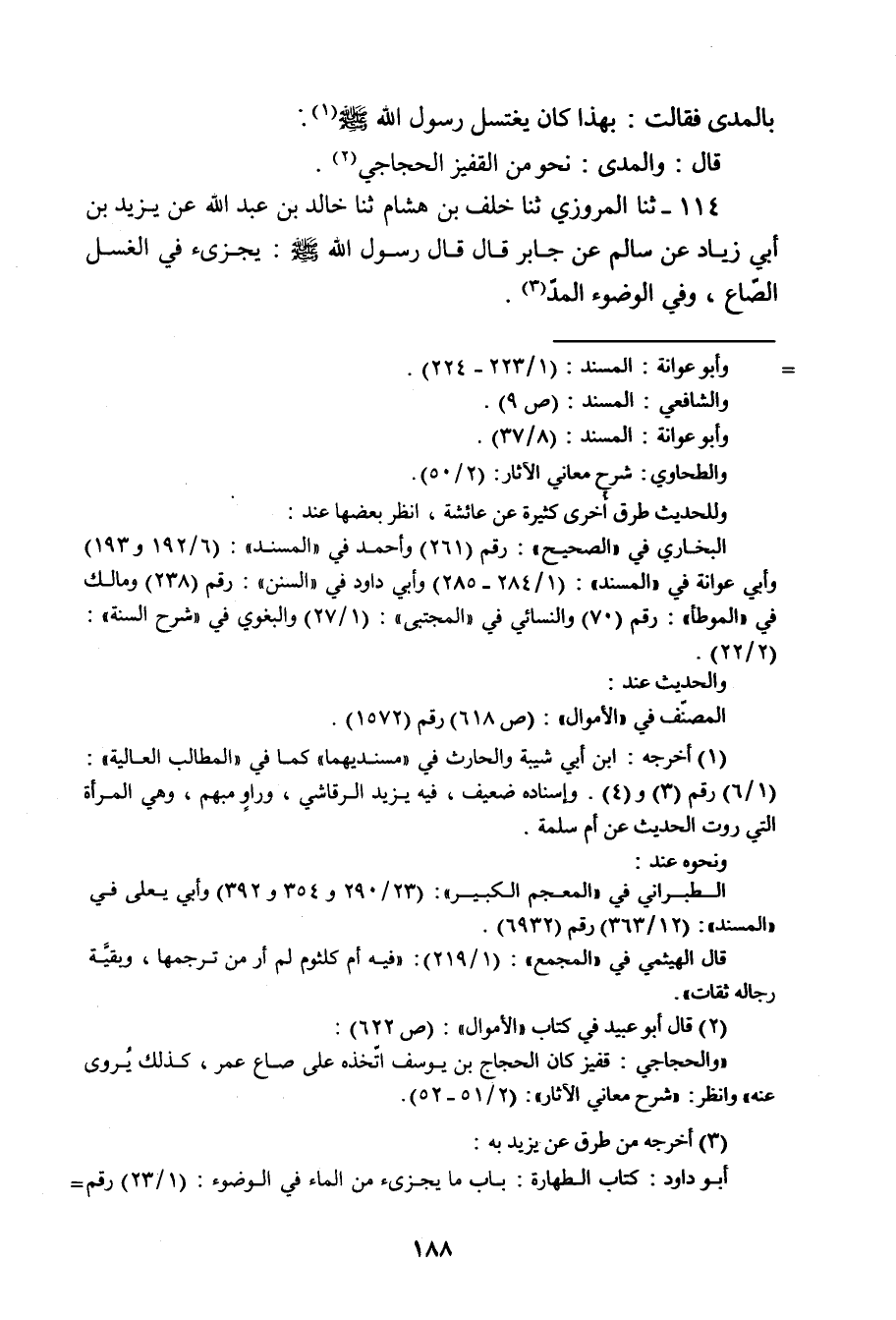 114 - ثنا الْمَرْوَزِيُّ، ثنا خَلَفُ بْنُ هِشَامٍ، , ثنا خَالِدُ بْنُ عَبْدِ اللَّهِ، عَنْ يَزِيدَ بْنِ أَبِي زِيَادٍ، عَنْ سَالِمٍ، عَنْ جَابِرٍ، قَالَ: قَالَ رَسُولُ اللَّهِ صَلَّى اللَّهُ عَلَيْهِ وَسَلَّمَ: «§يُجْزِئُ فِي الْغُسْلِ الصَّاعُ , وَفِي الْوُضُوءِ الْمُدُّ»