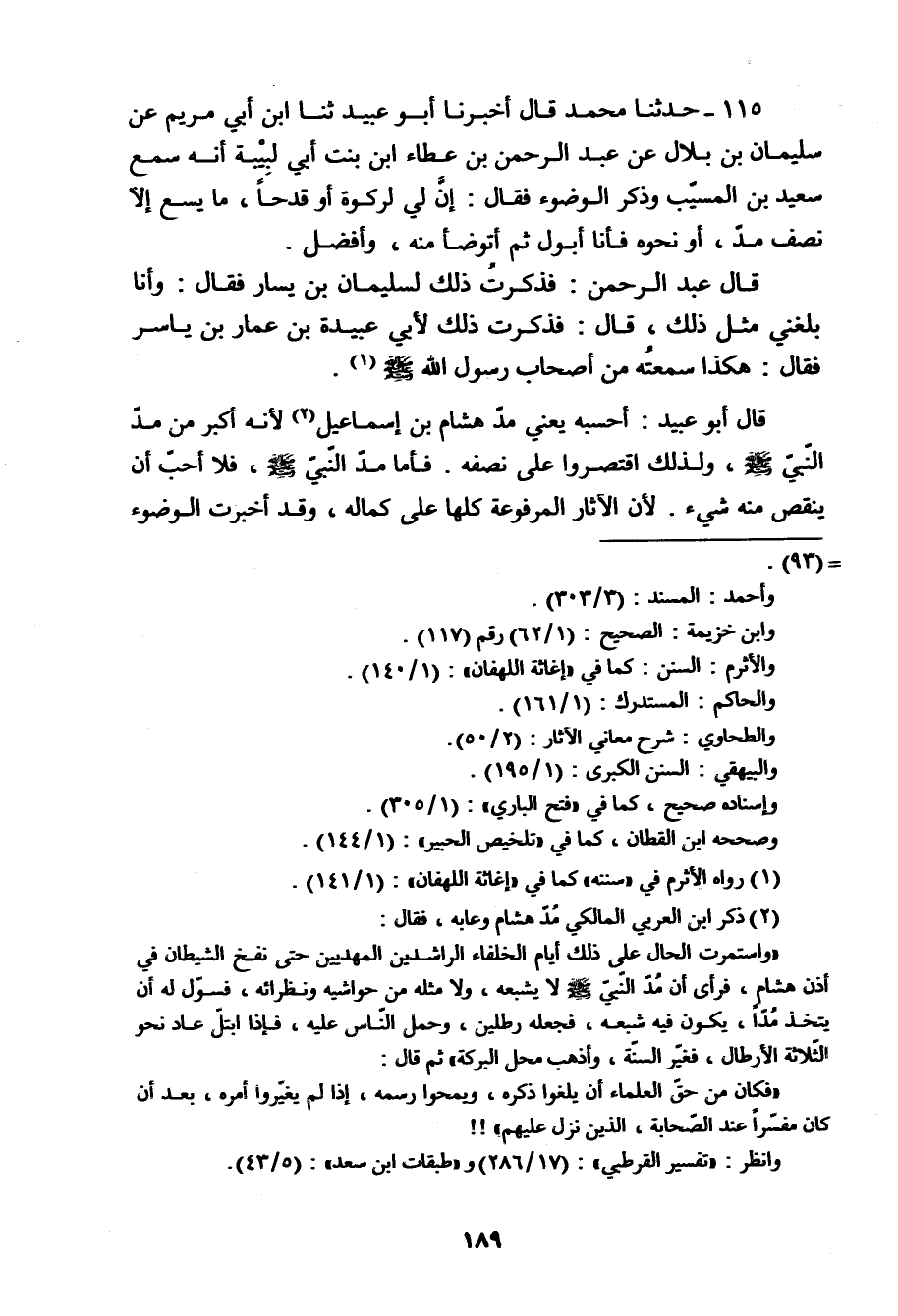 115 - حَدَّثَنَا مُحَمَّدٌ، قَالَ: أَخْبَرَنَا أَبُو عُبَيْدٍ ثنا ابْنُ أَبِي مَرْيَمَ، عَنْ سُلَيْمَانَ بْنِ بِلَالٍ، عَنْ عَبْدِ الرَّحْمَنِ بْنِ عَطَاءِ ابْنِ بِنْتِ أَبِي لَبِيبَةَ , أَنَّهُ سَمِعَ سَعِيدَ بْنَ الْمُسَيِّبِ، وَذَكَرَ الْوُضُوءَ، فَقَالَ: «§إِنَّ لِي لَرَكْوَةً أَوْ قَدَحًا , مَا يَسَعُ إِلَّا نِصْفَ مُدٍّ , أَوْ نَحْوَهُ فَأَنَا أَبُولُ ثُمَّ أَتَوَضَّأَ مِنْهُ , وَأُفْضِلُ» قَالَ عَبْدُ الرَّحْمَنِ: فَذَكَرْتُ ذَلِكَ لِسُلَيْمَانَ بْنِ يَسَارٍ , فَقَالَ وَأَنَا بَلَغَنِي مِثْلُ ذَلِكَ , قَالَ: فَذَكَرْتُ ذَلِكَ لِأَبِي عُبَيْدَةَ بْنِ عَمَّارِ بْنِ يَاسِرٍ فَقَالَ: هَكَذَا سَمِعْتُهُ مِنْ أَصْحَابِ رَسُولِ اللَّهِ صَلَّى اللَّهُ عَلَيْهِ وَسَلَّمَ قَالَ أَبُو عُبَيْدٍ: أَحْسِبُهُ يَعْنِي مُدَّ هِشَامِ بْنِ إِسْمَاعِيلَ لِأَنَّهُ أَكْبَرُ مِنْ مُدِّ النَّبِيِّ صَلَّى اللَّهُ عَلَيْهِ وَسَلَّمَ , وَلِذَلِكَ اقْتَصَرُوا عَلَى نِصْفِهِ. فَأَمَّا مُدُّ النَّبِيِّ صَلَّى اللَّهُ عَلَيْهِ وَسَلَّمَ فَلَا أُحِبُّ أَنْ يَنْقُصَ مِنْهُ شَيْءٌ. لِأَنَّ الْآثَارَ الْمَرْفُوعَةَ كُلَّهَا عَلَى كَمَالِهِ , وَقَدْ أُخْبِرْتُ الْوُضُوءَ -[190]- بِهِ كَافِيًا إِذَا لَمْ يَكُنْ مَعَهُ اسْتِنْجَاءٌ , وَمَبْلَغُهُ فِي الْوَزْنِ وَالْكَيْلِ رَطْلٌ وَثُلُثٌ , فِي قَوْلِ أَهْلِ الْحِجَازِ , وَرَطْلَانِ فِي قَوْلِ أَهْلِ الْعِرَاقِ , وَبِقَولِ أَهْلِ الْحِجَازِ نَأْخُذُ , وَقَدْ فَسَّرْنَاهُ فِي كِتَابِ الْأَمْوَالِ