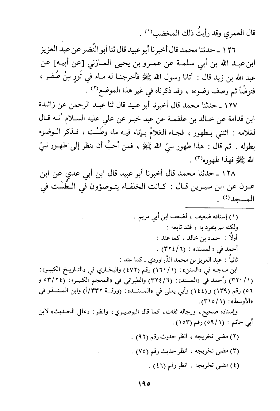 126 - حَدَّثَنَا مُحَمَّدٌ، قَالَ: أَخْبَرَنَا أَبُو عُبَيْدٍ ثنا أَبُو النَّضْرِ، عَنْ عَبْدِ الْعَزِيزِ بْنِ عَبْدِ اللَّهِ بْنِ أَبِي سَلَمَةَ، عَنْ عَمْرِو بْنِ يَحْيَى الْمَازِنِيِّ، عَنْ أَبِيهِ، عَنْ عَبْدِ اللَّهِ بْنِ زَيْدٍ، قَالَ: أَتَانَا رَسُولُ اللَّهِ صَلَّى اللَّهُ عَلَيْهِ وَسَلَّمَ §فَأَخْرَجْنَا لَهُ مَاءً فِي تَوْرٍ مِنْ صُفْرٍ , فَتَوَضَّأَ ثُمَّ وَصَفَ وُضُوءَهُ , وَقَدْ ذَكَرْنَاهُ فِي غَيْرِ هَذَا الْمَوْضِعِ
