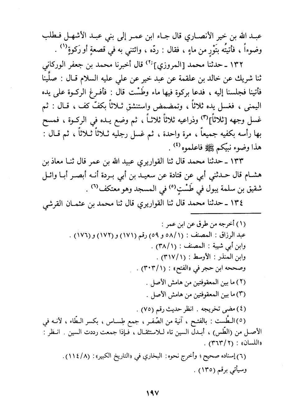 134 - حَدَّثَنَا مُحَمَّدٌ، قَالَ: ثنا الْقَوَارِيرِيُّ، قَالَ: ثنا مُحَمَّدُ بْنُ عُثْمَانَ الْقُرَشِيُّ، -[198]- قَالَ: ثنا جَبَلَةُ بْنُ سُلَيْمَانَ، أَنَّهُ §أَبْصَرَ سَعِيدَ بْنَ جُبَيْرٍ يَتَوَضَّأُ فِي طَسْتٍ فِي الْمَسْجِدِ