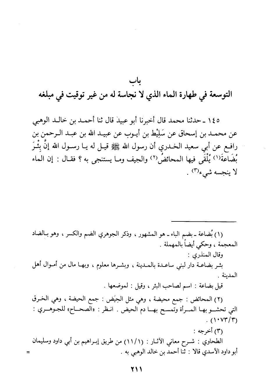 145 - حَدَّثَنَا مُحَمَّدٌ، قَالَ: أَخْبَرَنَا أَبُو عُبَيْدٍ ثنا أَحْمَدُ بْنُ خَالِدٍ الْوَهْبِيُّ، عَنْ مُحَمَّدِ بْنِ إِسْحَاقَ، عَنْ سَلِيطِ بْنِ أَيُّوبَ، عَنْ عُبَيْدِ اللَّهِ بْنِ عَبْدِ الرَّحْمَنِ بْنِ رَافِعٍ، عَنْ أَبِي سَعِيدٍ الْخُدْرِيِّ، أَنَّ رَسُولَ اللَّهِ صَلَّى اللَّهُ عَلَيْهِ وَسَلَّمَ قِيلَ لَهُ: يَا رَسُولَ اللَّهِ إِنَّ بِئْرَ بُضَاعَةَ يُلْقَى فِيهَا الْمَحَائِضُ وَالْجِيَفُ وَمَا يُسْتَنْجَى بِهِ؟ فَقَالَ: «§إِنَّ الْمَاءَ لَا يُنَجِّسُهُ شَيْءٌ» -[214]-