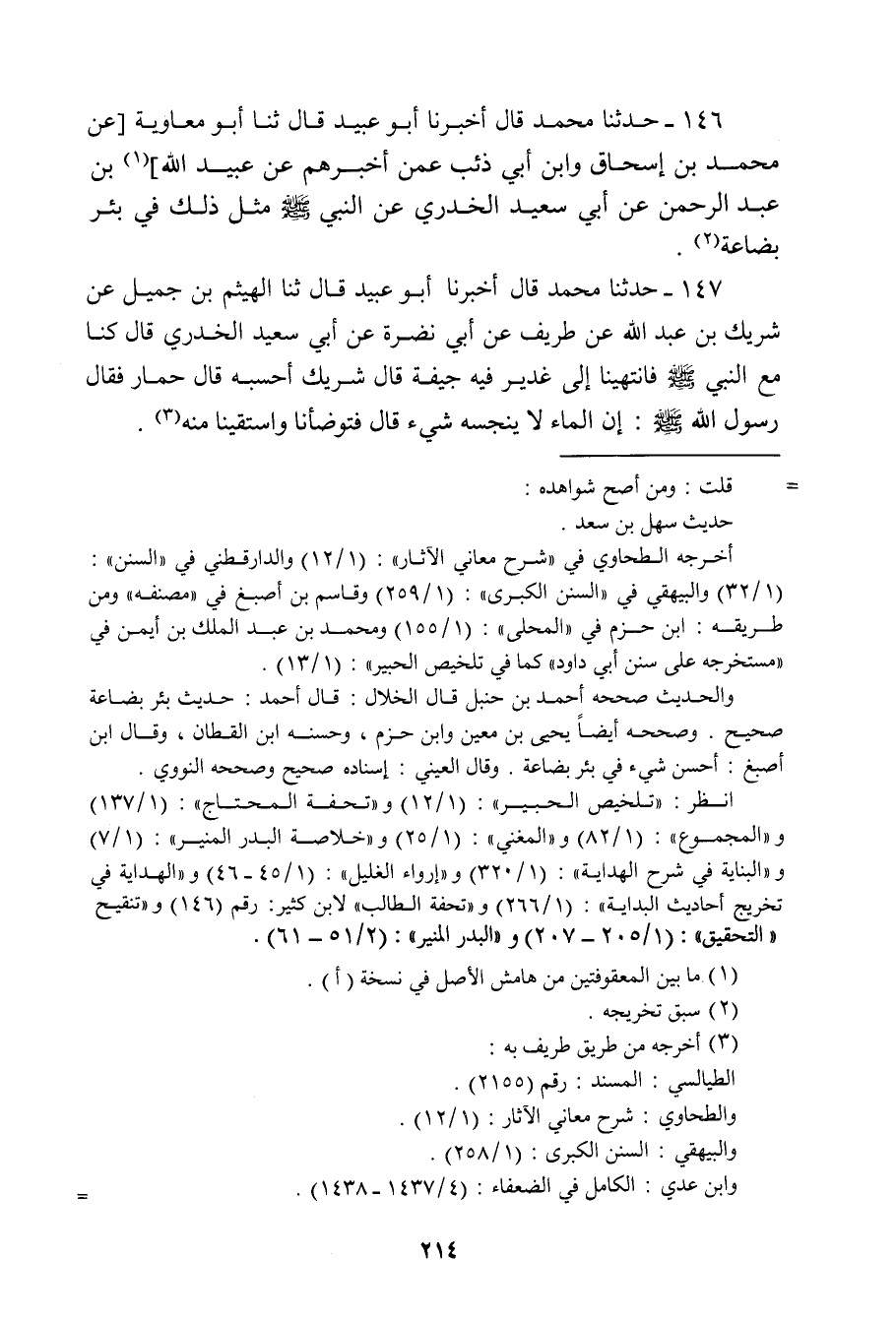 147 - حَدَّثَنَا مُحَمَّدٌ، قَالَ: أَخْبَرَنَا أَبُو عُبَيْدٍ، ثنا الْهَيْثَمُ بْنُ جَمِيلٍ، عَنْ شَرِيكِ بْنِ عَبْدِ اللَّهِ، عَنْ طَرِيفٍ، عَنْ أَبِي نَضْرَةَ، عَنْ أَبِي سَعِيدٍ الْخُدْرِيِّ، قَالَ: كُنَّا مَعَ النَّبِيِّ صَلَّى اللَّهُ عَلَيْهِ وَسَلَّمَ فَانْتَهَيْنَا إِلَى غَدِيرٍ فِيهِ جِيفَةٌ قَالَ شَرِيكٌ أَحْسِبُهُ , قَالَ: حِمَارٌ , فَقَالَ رَسُولُ اللَّهِ صَلَّى اللَّهُ عَلَيْهِ وَسَلَّمَ: «§إِنَّ الْمَاءَ لَا يُنَجِّسُهُ شَيْءٌ» قَالَ: «فَتَوَضَّأْنَا وَاسْتَقَيْنَا مِنْهُ» ، -[215]-