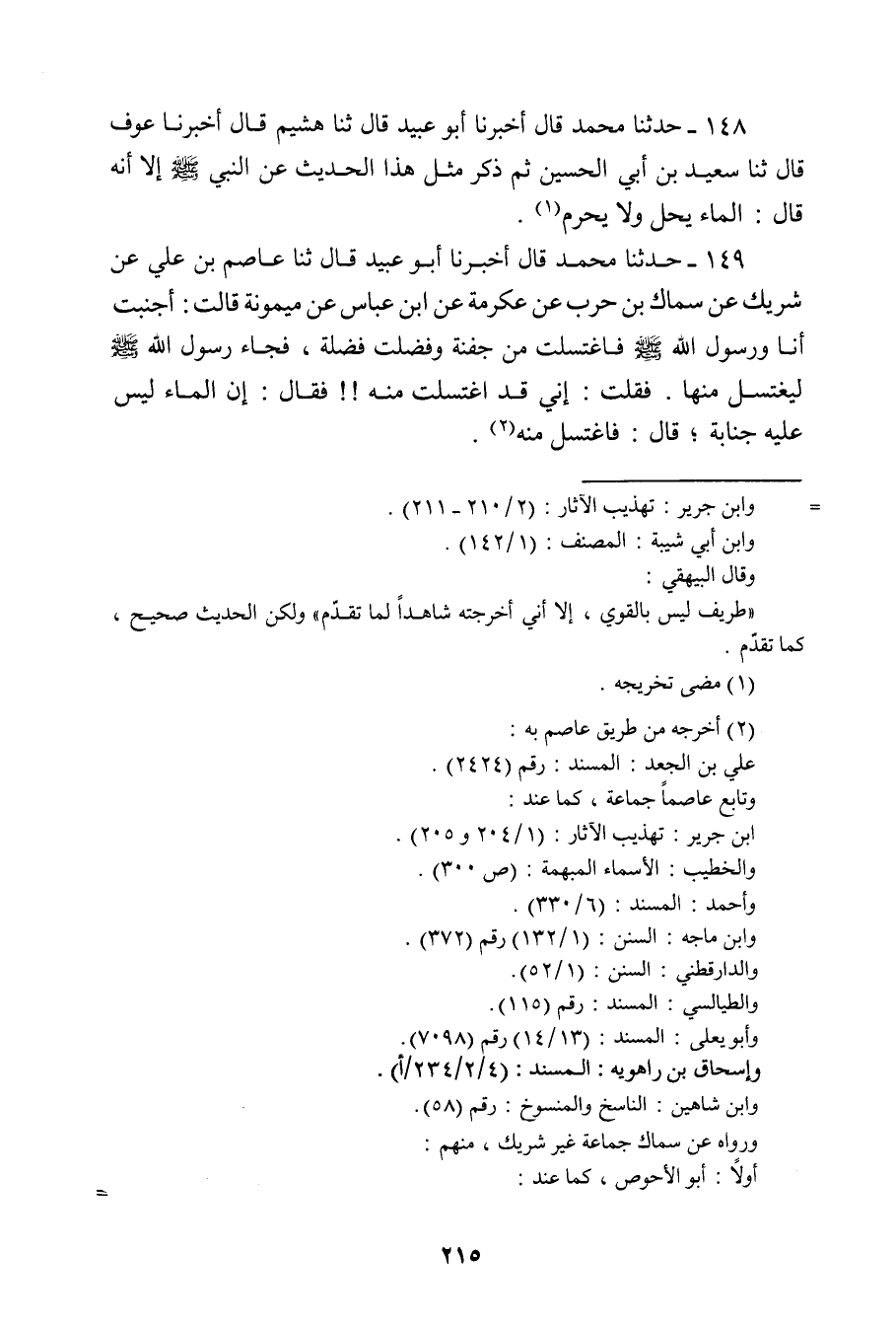 149 - حَدَّثَنَا مُحَمَّدٌ، قَالَ: أَخْبَرَنَا أَبُو عُبَيْدٍ ثنا عَاصِمُ بْنُ عَلِيٍّ، عَنْ شَرِيكٍ، عَنْ سِمَاكِ بْنِ حَرْبٍ، عَنْ عِكْرِمَةَ، عَنِ ابْنِ عَبَّاسٍ، عَنْ مَيْمُونَةَ، قَالَتْ: أَجْنَبْتُ أَنَا وَرَسُولُ اللَّهِ، صَلَّى اللَّهُ عَلَيْهِ وَسَلَّمَ فَاغْتَسَلْتُ مِنْ جَفْنَةٍ وَفَضَلَتْ فَضْلَةٌ , فَجَاءَ رَسُولُ اللَّهِ صَلَّى اللَّهُ عَلَيْهِ وَسَلَّمَ لِيَغْتَسِلَ مِنْهَا , فَقُلْتُ: إِنِّي قَدِ اغْتَسَلْتُ مِنْهُ فَقَالَ: «§إِنَّ الْمَاءَ لَيْسَ عَلَيْهِ جَنَابَةٌ» , قَالَ: فَاغْتَسَلَ مِنْهُ -[217]-