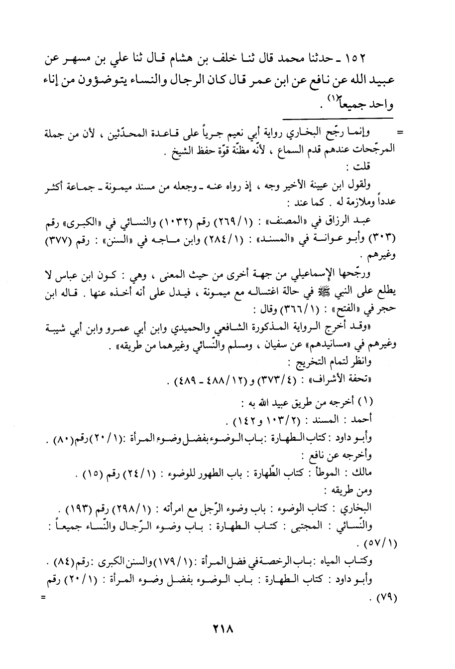 152 - حَدَّثَنَا مُحَمَّدٌ، قَالَ: ثنا خَلَفُ بْنُ هِشَامٍ، قَالَ: ثنا عَلِيُّ بْنُ مُسْهِرٍ، عَنْ عُبَيْدِ اللَّهِ، عَنْ نَافِعٍ، عَنِ ابْنِ عُمَرَ، قَالَ: «§كَانَ الرِّجَالُ وَالنِّسَاءُ يَتَوَضَّئُونَ مِنْ إِنَاءٍ وَاحِدٍ جَمِيعًا»