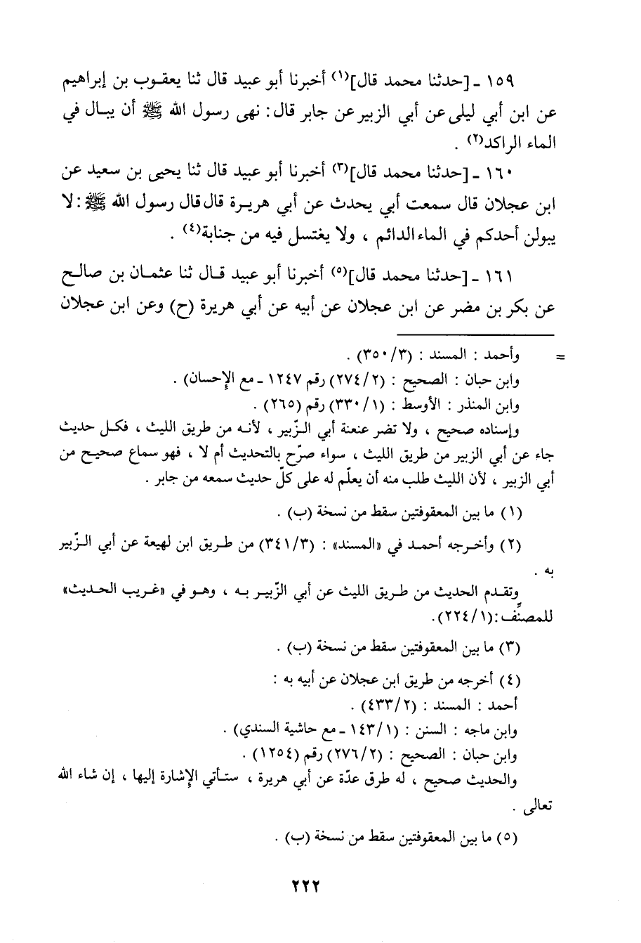 161 - حَدَّثَنَا مُحَمَّدٌ، قَالَ: أَخْبَرَنَا أَبُو عُبَيْدٍ ثنا عُثْمَانُ بْنُ صَالِحٍ، عَنْ بَكْرِ بْنِ مُضَرٍ، عَنِ ابْنِ عَجْلَانَ، عَنْ أَبِيهِ، عَنْ أَبِي هُرَيْرَةَ، وَعَنِ ابْنِ عَجْلَانَ، -[223]- عَنْ أَبِي الزِّنَادِ، عَنِ الْأَعْرَجِ، عَنْ أَبِي هُرَيْرَةَ، وَكِلَاهُمَا، عَنِ النَّبِيِّ صَلَّى اللَّهُ عَلَيْهِ وَسَلَّمَ قَالَ: «§لَا يَبُولَنَّ أَحَدُكُمْ فِي الْمَاءِ الدَّائِمِ , وَلَا يَغْتَسِلُ فِيهِ مِنْ جَنَابَةٍ»