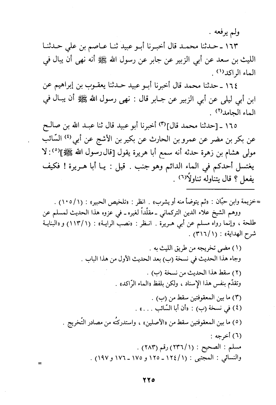 163 - حَدَّثَنَا مُحَمَّدٌ، قَالَ: أَخْبَرَنَا أَبُو عُبَيْدٍ ثنا عَاصِمُ بْنُ عَلِيٍّ، حَدَّثَنَا اللَّيْثُ بْنُ سَعْدٍ، عَنْ أَبِي الزُّبَيْرِ، عَنْ جَابِرٍ، عَنْ رَسُولِ اللَّهِ صَلَّى اللَّهُ عَلَيْهِ وَسَلَّمَ أَنَّهُ «§نَهَى أَنْ يُبَالَ فِي الْمَاءِ الرَّاكِدِ»