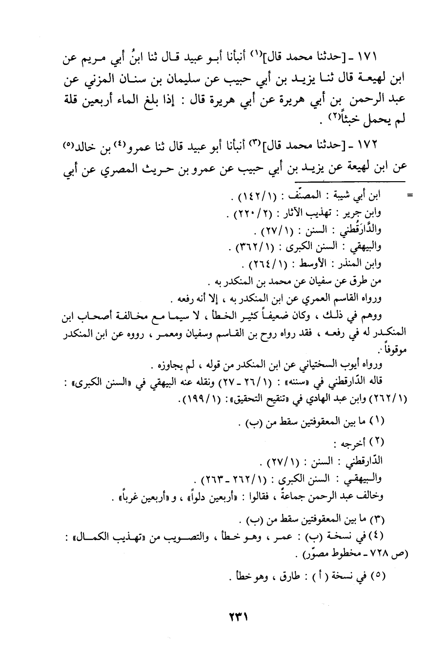171 - حَدَّثَنَا مُحَمَّدٌ، قَالَ: أَخْبَرَنَا أَبُو عُبَيْدٍ ثنا ابْنُ أَبِي مَرْيَمَ، عَنِ ابْنِ لَهِيعَةَ، قَالَ: ثنا يَزِيدُ بْنُ أَبِي حَبِيبٍ، عَنْ سُلَيْمَانَ بْنِ سِنَانٍ الْمُزَنِيِّ، عَنْ عَبْدِ الرَّحْمَنِ بْنِ أَبِي هُرَيْرَةَ، عَنْ أَبِي هُرَيْرَةَ، قَالَ: «§إِذَا بَلَغَ الْمَاءُ أَرْبَعِينَ قُلَّةً لَمْ يَحْمِلْ خَبَثًا»