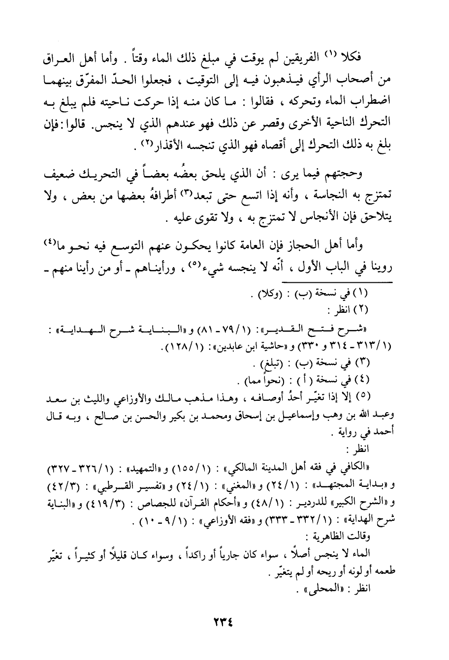 فَكِلَا الْفَرِيقَيْنِ لَمْ يُوَقِّتْ فِي مَبْلَغِ ذَلِكَ الْمَاءِ وَقْتًا، وَأَمَّا أَهْلُ الْعِرَاقِ مِنْ أَصْحَابِ الرَّأْيِ فَيَذْهَبُونَ فِيهِ إِلَى التَّوْقِيتِ فَجَعَلُوا الْحَدَّ الْمُفَرِّقَ بَيْنَهُمَا اضْطِرَابُ الْمَاءِ وَتَحَرُّكُهُ , فَقَالُوا: مَا كَانَ مِنْهُ إِذَا حَرَّكْتَ نَاحِيَتَهُ فَلَمْ يَبْلُغْ بِهِ التَّحَرُّكُ النَّاحِيَةَ الْأُخْرَى وَقَصُرَ عَنْ ذَلِكَ فَهُوَ عِنْدَهُمُ الَّذِي لَا يَنْجُسُ قَالُوا: فَإِنْ بَلَغَ بِهِ ذَلِكَ التَّحَرُّكُ إِلَى أَقْصَاهُ فَهُوَ الَّذِي تُنَجِّسُهُ الْأَقْذَارُ. وَحُجَّتُهُمْ فِيمَا يُرَى: أَنَّ الَّذِي يَلْحَقُ بَعْضُهُ بَعْضًا فِي التَّحْرِيكِ ضَعِيفٌ تَمْتَزِجُ بِهِ النَّجَاسَةُ , وَأَنَّهُ إِذَا اتَّسَعَ حَتَّى تَبْعُدَ أَطْرَافُهُ بَعْضُهَا مِنْ بَعْضٍ , وَلَا يَتَلَاحَقُ فَإِنَّ الْأَنْجَاسَ لَا تَمْتَزِجُ بِهِ , وَلَا تَقْوَى عَلَيْهِ. وَأَمَّا أَهْلُ الْحِجَازِ فَإِنَّ الْعَامَّةَ كَانُوا يَحْكُونَ عَنْهُمُ التَّوَسُّعَ فِيهِ نَحْوَ مَا رَوَيْنَا فِي الْبَابِ الْأَوَّلِ , أَنَّهُ لَا يُنَجِّسُهُ شَيْءٌ , وَرَأَيْنَاهُمْ , أَوْ مَنْ رَأَيْنَا مِنْهُمْ ,