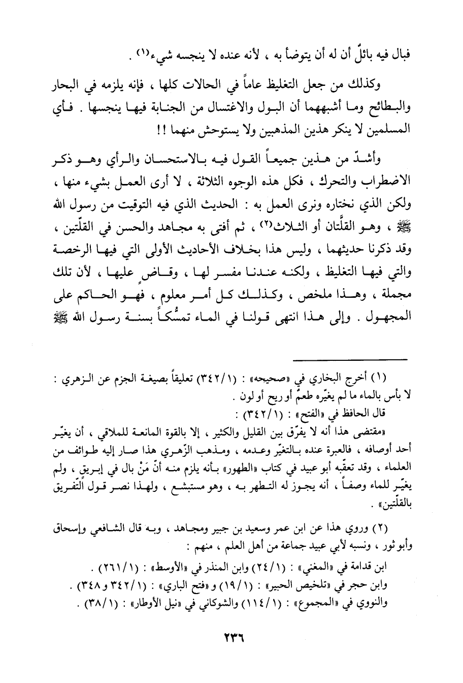فَبَالَ فِيهِ بَائِلٌ: إِنَّ لَهُ أَنْ يَتَوَضَّأَ بِهِ , لِأَنَّهُ عِنْدَهُ لَا يُنَجِّسُهُ شَيْءٌ. وَكَذَلِكَ مَنْ جَعَلَ التَّغْلِيظَ عَامًّا فِي الْحَالَاتِ كُلِّهَا , فَإِنَّهُ يَلْزَمُهُ فِي الْبِحَارِ وَالْبَطَائِحِ وَمَا أَشْبَهَهُمَا: أَنَّ الْبَوْلَ وَالِاغْتِسَالَ مِنَ الْجَنَابَةِ فِيهَا يُنَجِّسُهَا , فَأَيُّ الْمُسْلِمِينَ لَا يُنْكِرُ هَذَيْنِ الْمَذْهَبَيْنِ وَلَا يَسْتَوْحِشُ مِنْهُمَا وَأَشَدُّ مِنْ هَذَيْنِ جَمِيعًا الْقَوْلُ فِيهِ بِالِاسْتِحْسَانِ وَالرَّأْيِ وَهُوَ ذِكْرُ الِاضْطِرَابِ وَالتَّحَرُّكِ , فَكُلُّ هَذِهِ الْوُجُوهِ الثَّلَاثَةِ , لَا أَرَى الْعَمَلَ بِشَيْءٍ مِنْهَا , وَلَكِنَّ الَّذِي نَخْتَارُهُ وَنَرَى الْعَمَلَ بِهِ: الْحَدِيثُ الَّذِي فِيهِ التَّوْقِيتُ مِنْ رَسُولِ اللَّهِ صَلَّى اللَّهُ عَلَيْهِ وَسَلَّمَ , وَهُوَ الْقُلَّتَانِ أَوِ الثَّلَاثُ , ثُمَّ أَفْتَى بِهِ مُجَاهِدٌ وَالْحَسَنُ فِي الْقُلَّتَيْنِ , وَقَدْ ذَكَرْنَا حَدِيثَهُمَا , وَلَيْسَ هَذَا بِخِلَافِ الْأَحَادِيثِ الْأُولَى الَّتِي فِيهَا الرُّخْصَةُ وَالَّتِي فِيهَا التَّغْلِيظُ , وَلَكِنَّهُ عِنْدَنَا مُفَسِّرٌ لَهَا , وَقَاضٍ عَلَيْهَا , لِأَنَّ تِلْكَ مُجْمَلَةٌ , وَهَذَا مُلَخِّصٌ , وَكَذَلِكَ كُلُّ أَمْرٍ مَعْلُومٍ , فَهُوَ الْحَاكِمُ عَلَى الْمَجْهُولِ , وَإِلَى هَذَا انْتَهَى قَوْلُنَا فِي الْمَاءِ تَمَسُّكًا بِسُنَّةِ رَسُولِ اللَّهِ صَلَّى اللَّهُ عَلَيْهِ وَسَلَّمَ