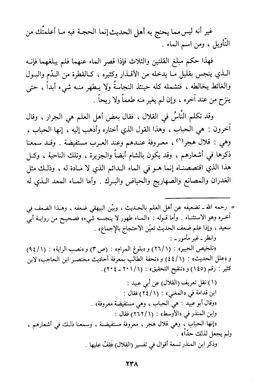 غَيْرَ أَنَّهُ لَيْسَ مِمَّا يَحْتَجُّ بِهِ أَهْلُ الْحَدِيثِ، إِنَّمَا الْحُجَّةُ فِيهِ مَا أَعْلَمْتُكَ مِنَ التَّأْوِيلِ , وَمِنَ اسْمِ الْمَاءِ. فَهَذَا حُكْمُ مَبْلَغِ الْقُلَّتَيْنِ وَالثَّلَاثِ فَإِذَا قَصُرَ الْمَاءُ عَنْهُمَا , فَلَمْ يَبْلُغْهُمَا فَإِنَّهُ الَّذِي يَنْجُسُ بِقَلِيلِ مَا يَدْخُلُهُ مِنَ الْأَقْذَارِ وَكَثِيرِهِ , كَالْقَطْرَةِ مِنَ الدَّمِ وَالْبَوْلِ وَالْغَائِطِ يُخَالِطُهُ , فَتَشْمَلُهُ كُلَّهُ حِينَئِذٍ النَّجَاسَةُ , وَلَا يَطْهُرُ مِنْهُ شَيْءٌ أَبَدًا , حَتَّى يُنْزَحَ مِنْ عِنْدِ آخِرِهِ , وَإِنْ لَمْ يُغَيِّرْ مِنْهُ طَعْمًا وَلَا رِيحًا. وَقَدْ تَكَلَّمَ النَّاسُ فِي الْقِلَالِ , فَقَالَ بَعْضُ أَهْلِ الْعِلْمِ: هِيَ الْجِرَارُ , وَقَالَ آخَرُونَ: هِيَ الْحُبَابُ , وَهَذَا الْقَوْلُ الَّذِي أَخْتَارُهُ وَأَذْهَبُ إِلَيْهِ , إِنَّهَا الْحُبَابُ , وَهِيَ: قِلَالُ هَجَرٍ , مَعْرُوفَةٌ عِنْدَهُمْ وَعِنْدَ الْعَرَبِ مُسْتَفِيضَةٌ. وَقَدْ سَمِعْنَا ذِكْرَهَا فِي أَشْعَارِهِمْ , وَقَدْ يَكُونُ بِالشَّامِ أَيْضًا وَالْجَزِيرَةِ , وَتِلْكَ النَّاحِيَةِ , وَكُلُّ هَذَا الَّذِي اقْتَصَصْنَاهُ إِنَّمَا هُوَ فِي الْمَاءِ الدَّائِمِ الَّذِي لَا مَادَّةَ لَهُ , وَذَلِكَ مِثْلُ الْغُدْرَانِ وَالْمَصَانِعِ وَالصَّهَارِيجِ وَالْحِيَاضِ وَالْبِرَكِ , وَأَمَّا الْمَاءُ الْمُعَدُّ الَّذِي لَهُ