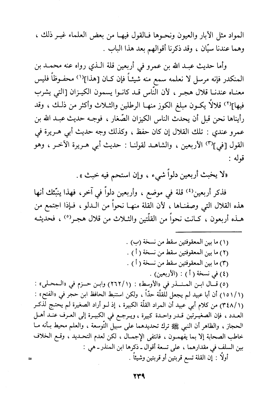 الْمَوَادُّ مِثْلَ الْآبَارِ وَالْعُيُونِ وَنَحْوِهَا فَالْقَوْلُ فِيهَا مِنْ بَعْضِ الْعُلَمَاءِ غَيْرُ ذَلِكَ , وَهُمَا عِنْدَنَا سِيَّانٌ , وَقَدْ ذَكَرْنَا أَقْوَالَهُمْ بَعْدَ هَذَا الْبَابِ. وَأَمَّا حَدِيثُ عَبْدِ اللَّهِ بْنِ عَمْرٍو فِي أَرْبَعِينَ قُلَّةٍ الَّذِي رَوَاهُ عَنْهُ مُحَمَّدُ بْنُ الْمُنْكَدِرِ فَإِنَّهُ مُرْسَلٌ لَا نَعْلَمُهُ سَمِعَ مِنْهُ شَيْئًا فَإِنْ كَانَ هَذَا مَحْفُوظًا فَلَيْسَ مَعْنَاهُ عِنْدَنَا قِلَالُ هَجَرٍ , لِأَنَّ النَّاسَ قَدْ كَانُوا يُسَمُّونَ الْكِيزَانَ الَّتِي يُشْرَبُ فِيهَا قِلَالًا يَكُونُ مَبْلَغُ الْكُوزِ مِنْهَا , الرَّطْلَيْنِ وَالثَّلَاثَ وَأَكْثَرَ مِنْ ذَلِكَ , وَقَدْ رَأَيْنَاهَا نَحْنُ قَبْلَ أَنْ يُحْدِثَ النَّاسُ الْكِيزَانَ الصِّغَارَ , فَوَجْهُ حَدِيثِ عَبْدِ اللَّهِ بْنِ عَمْرٍو عِنْدِي , تِلْكَ الْقِلَالُ إِنْ كَانَ حَفِظَ , وَكَذَلِكَ وَجْهُ حَدِيثِ أَبِي هُرَيْرَةَ فِي الْقَوْلِ فِي أَرْبَعِينَ , وَالشَّاهِدُ لِقَوْلِنَا حَدِيثُ أَبِي هُرَيْرَةَ الْآخَرُ , وَهُوَ قَوْلُهُ: «لَا يُخْبِثُ أَرْبَعِينَ دَلْوًا شَيْءٌ , وَإِنِ اسْتَحَمَّ فِيهِ خَبَثٌ» فَذَكَرَ أَرْبَعِينَ قُلَّةً فِي مَوْضِعٍ , وَأَرْبَعِينَ دَلْوًا فِي آخَرَ , فَهَذَا يُنَبِّئُكَ أَنَّهَا هَذِهِ الْقِلَالُ الَّتِي وَصَفْنَاهَا , لِأَنَّ الْقُلَّةَ مِنْهَا نَحْوٌ مِنَ الدَّلْوِ , فَإِذَا اجْتَمَعَ مِنْ هَذِهِ أَرْبَعُونَ , كَانَتْ نَحْوًا مِنَ الْقُلَّتَيْنِ وَالثَّلَاثِ مِنْ قِلَالِ هَجَرٍ , فَحَدِيثُهُ