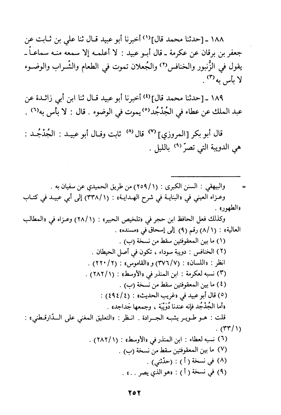 189 - حَدَّثَنَا مُحَمَّدٌ، قَالَ: أَخْبَرَنَا أَبُو عُبَيْدٍ ثنا ابْنُ أَبِي زَائِدَةَ، عَنْ عَبْدِ الْمَلِكِ، عَنْ عَطَاءٍ، فِي §الْجُدْجُدِ يَمُوتُ فِي الْوُضُوءِ , قَالَ: «لَا بَأْسَ بِهِ» قَالَ أَبُو بَكْرٍ الْمَرْوَزِيُّ , قَالَ: ثَابِتٌ وَقَالَ أَبُو عُبَيْدٍ: الْجُدْجُدُ: هِيَ الدُّوَيْبَةُ الَّتِي تَصُرُّ بِاللَّيْلِ