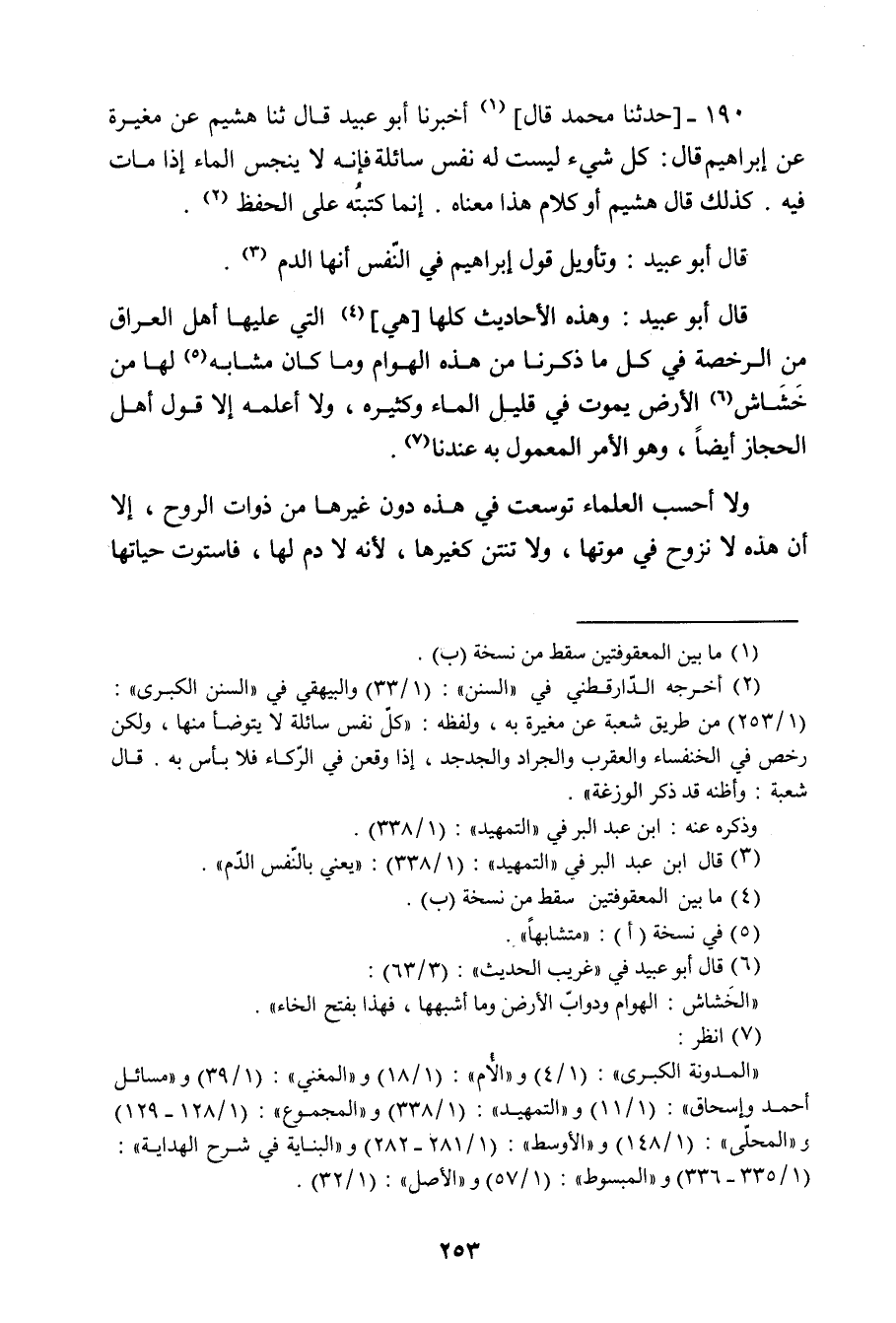 190 - حَدَّثَنَا مُحَمَّدٌ، قَالَ: أَخْبَرَنَا أَبُو عُبَيْدٍ ثنا هُشَيْمٌ، , عَنْ مُغِيرَةَ، عَنْ إِبْرَاهِيمَ، قَالَ: «§كُلُّ شَيْءٍ لَيْسَتْ لَهُ نَفْسٌ سَائِلَةٌ فَإِنَّهُ لَا يُنَجِّسُ الْمَاءَ إِذَا مَاتَ فِيهِ» كَذَلِكَ قَالَ هُشَيْمٌ أَوْ كَلَامٌ هَذَا مَعْنَاهُ. إِنَّمَا كَتَبْتُهُ عَلَى الْحِفْظِ، قَالَ أَبُو عُبَيْدٍ: وَتَأْوِيلُ قَوْلِ إِبْرَاهِيمَ فِي النَّفْسِ أَنَّهَا الدَّمُ قَالَ أَبُو عُبَيْدٍ: وَهَذِهِ الْأَحَادِيثُ كُلُّهَا هِيَ الَّتِي عَلَيْهَا أَهْلُ الْعِرَاقِ مِنَ الرُّخْصَةِ فِي كُلِّ مَا ذَكَرْنَا مِنْ هَذِهِ الْهَوَامِ , وَمَا كَانَ مُشَابِهًا لَهَا مِنْ خَشَاشِ الْأَرْضِ , يَمُوتُ فِي قَلِيلِ الْمَاءِ وَكَثِيرِهِ , وَلَا أَعْلَمُهُ إِلَّا قَوْلُ أَهْلِ الْحِجَازِ أَيْضًا , وَهُوَ الْأَمْرُ الْمَعْمُولُ بِهِ عِنْدَنَا. وَلَا أَحْسِبُ الْعُلَمَاءَ تَوَسَّعَتْ فِي هَذِهِ دُونَ غَيْرِهَا مِنْ ذَوَاتِ الرُّوحِ , إِلَّا أَنَّ هَذِهِ لَا نُزُوحَ فِي مَوْتِهَا , وَلَا تُنْتِنُ كَغَيْرِهَا , لِأَنَّهُ لَا دَمَ لَهَا , فَاسْتَوَتْ حَيَاتُهَا -[254]- وَمَوْتُهَا , وَكَذَلِكَ مَا كَانَ مِنْ نَحْوِهَا كَالْجَنَادِبِ وَالصَّرَاصِرِ وَالْعَنَاكِبِ , وَالْعَقَارِبِ , وَجَمْعُ هَوَامِ الْأَرْضِ هُوَ عِنْدِي مِثْلُ تِلْكَ الْأُولَى فَأَمَّا دَوَابُّ الْمَاءِ لَا مَوْتَ فِيهِ مِثْلُ السَّمَكِ وَالضَّفَادِعِ وَالسَّلَاحِفِ وَالسَّرَاطِينِ وَنَحْوِهِنَّ وَلَا أَحْسِبُ الرُّخْصَةَ فِيهَا جَاءَتْ مِنْ جِهَةِ تِلْكَ , لِأَنَّ هَذِهِ قَدْ تَكُونُ لِبَعْضِهَا دَمٌ , وَلَكِنَّ ذَاكَ عِنْدِي لِأَنَّ مَسَاكِنَهَا الْمَاءُ وَبِهِ قِوَامُهَا فَكَيْفَ تُنَجِّسُهُ وَهِيَ مِنْهُ وَلَهُ؟ فَلِهَذَا أَجْمَعَ النَّاسُ عَلَى السَّعَةِ فِيهَا. وَكَذَلِكَ يَنْبَغِي أَنْ يَكُونَ قَوْلُ الْعُلَمَاءِ فِي الْجَرَادِ , بَلْ هُوَ أَكْثَرُ مِنْهَا فِي هَذَا الْمَعْنَى مِنْ جِهَتَيْنِ , أَحَدُهُمَا: أَنَّ بَعْضَهُمْ تَجْعَلُهُ فِي صَيْدِ الْبَحْرِ فَيَقُولُ: هُوَ بَثْرَةُ حُوتٍ. وَالْأُخْرَى: أَنَّهُ لَيْسَ بِذِي دَمٍ وَالشَّاهِدُ عَلَى ذَلِكَ أَنَّهُ لَا -[255]- زَكَاةَ لَهُ , وَكَذَلِكَ السَّمَكُ لَا يُنَجِّسُ مَوْتُهُ الْمَاءَ , وَإِنْ ظَهْرَ لَهُ لَوْنُ الدَّمِ , فَإِنَّهُ لَا يُعَدُّ دَمًا , وَمِنْ أَجْلِ فَقْدِ الدَّمِ سَقَطَتْ عَنْهُ الزَّكَاةُ. قَالَ أَبُو عُبَيْدٍ: وَمَعَ هَذَا كُلِّهِ إِنَّهُ لَوْلَا الِاتِّبَاعُ لَكَانَ اجْتِنَابُ هَذِهِ كُلِّهَا وَإِتْيَانُ الْمَاءِ الَّذِي لَا يُخَالِطُهُ مِنَ الَّتِي وَصَفْنَا شَيْءٌ أَطْيَبُ لِلنَّفْسِ , وَأَبْرَأُ لِلصَّدْرِ , وَلَكِنَّا لَهُمْ , فِي كُلِّ مَا اجْتَمَعُوا عَلَيْهِ مُتَّبِعُونَ , فَلَا نَرَى شَيْئًا مِنْ هَذِهِ كُلِّهَا يُفْسِدُ عَلَى الرَّجُلِ طَهُورَهُ وَلَا صَلَاتَهُ وَأَمَّا الْحَيَّاتُ وَالْأَوْزَاغُ فَإِنَّهَا عِنْدَنَا مُفَارِقَةٌ لِكُلِّ مَا سَمَّيْنَا , وَذَلِكَ لِأَنَّ لَهَا دَمًا فِي رُؤُسِهَا , فَإِذَا مَاتَتْ فِي الْمَاءِ الَّذِي يَكُونُ دُونَ الْقُلَّتَيْنِ فَإِنَّهَا تُنَجِّسُهُ مِنْ عِنْدِ آخِرِهِ لِمَا أَعْلَمْتُكَ فِي الدَّمِ. وَأَحْسِبُ الْعَظَايَةَ مِثْلَهَا عَلَى أَنِّي لَمْ أَرَ مِثْلَهَا مَقْتُولًا فَأَعْرِفُ مَا فِيهِ مِنَ الدَّمِ