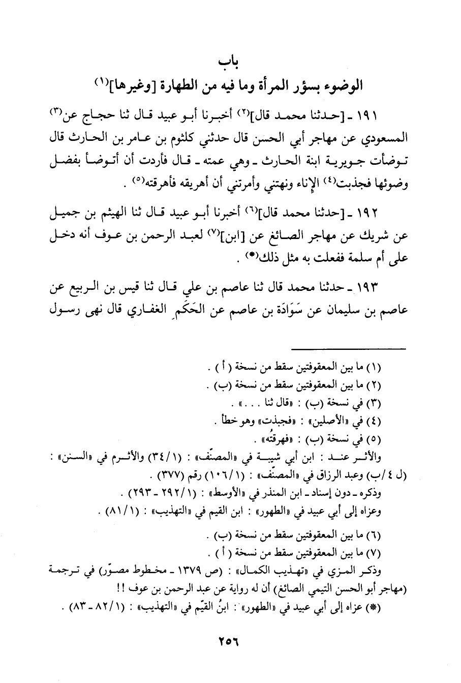 191 - حَدَّثَنَا مُحَمَّدٌ، قَالَ: أَخْبَرَنَا أَبُو عُبَيْدٍ ثنا حَجَّاجٌ، عَنِ الْمَسْعُودِيِّ، عَنْ مُهَاجِرٍ أَبِي الْحَسَنِ، قَالَ: حَدَّثَنِي كُلْثُومُ بْنُ عَامِرِ بْنِ الْحَارِثِ، قَالَ: تَوَضَّأَتْ جُوَيْرِيَةُ ابْنَةُ الْحَارِثِ , وَهِيَ عَمَّتُهُ , قَالَ: «§فَأَرَدْتُ أَنْ أَتَوَضَّأَ بِفَضْلِ وُضُوئِهَا فَجَذَبَتِ الْإِنَاءَ، وَنَهَتْنِي , وَأَمَرَتْنِي أَنْ أُهْرِيقَهُ؛ فَأَهْرَقْتُهُ»